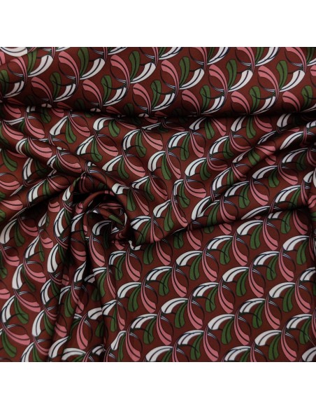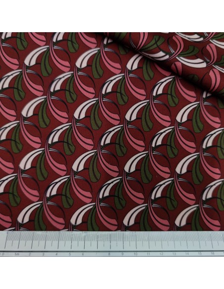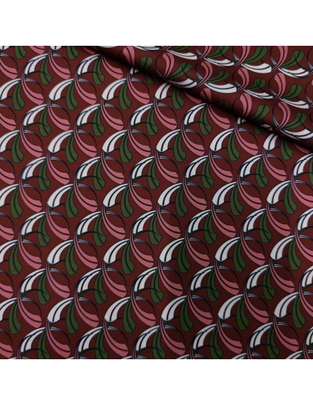 Tessuto in poliestere elasticizzato dell'Alta moda italiana. Fantasia che ricorda delle virgole sui toni del verde, rosa e rosa antico su sfondo granata. Tessuto molto morbido al tatto con un ottima caduta.