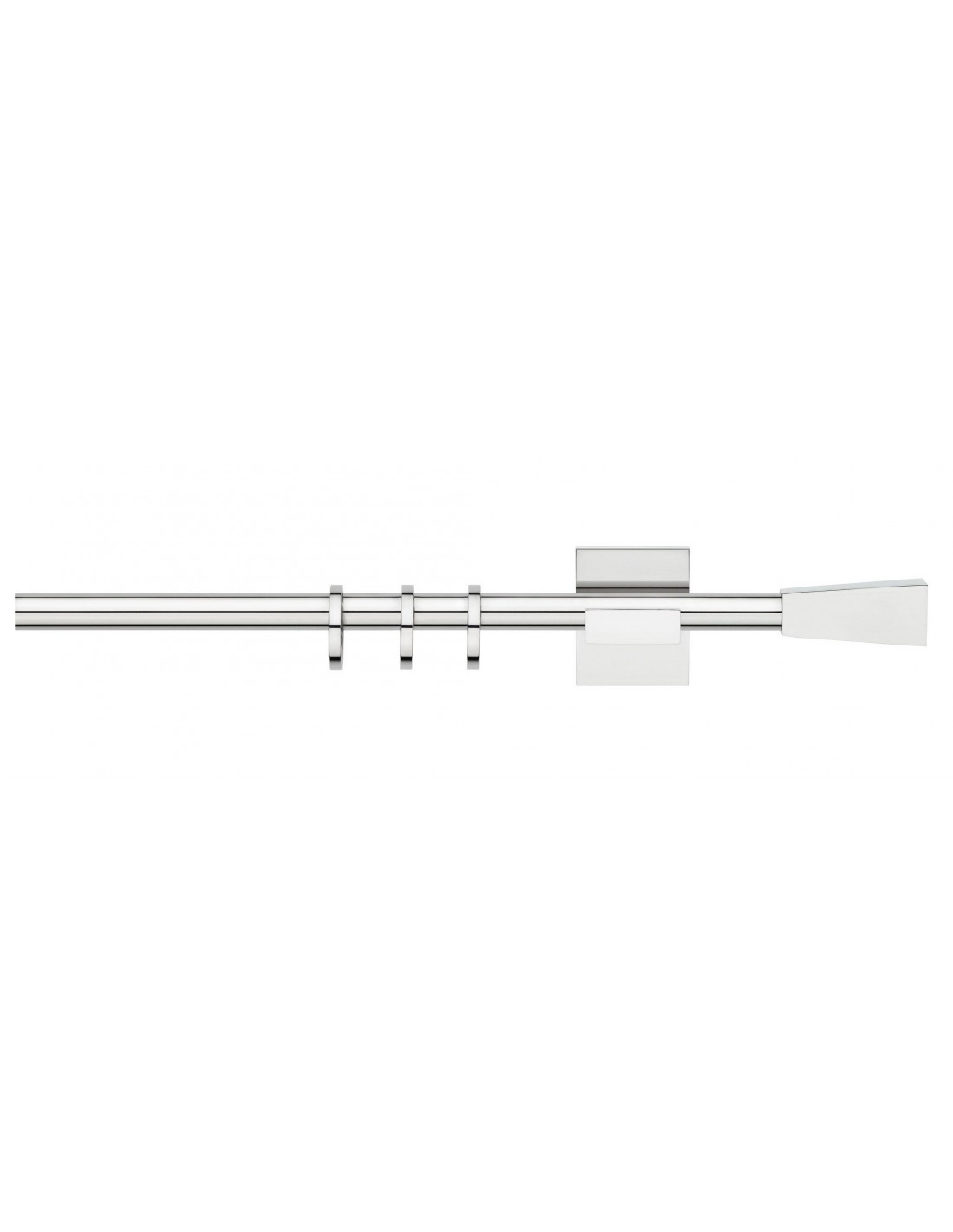 Nella confezione troverete il bastone in acciaio inox, i 2 tappi con forma moderna, 2 supporti a parete lunghi 7cm dal disegno moderno (dai 2mt di lunghezza 3supporti) e gli anelli
