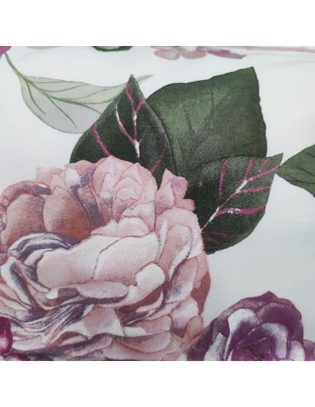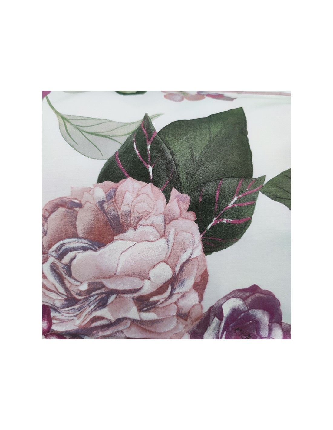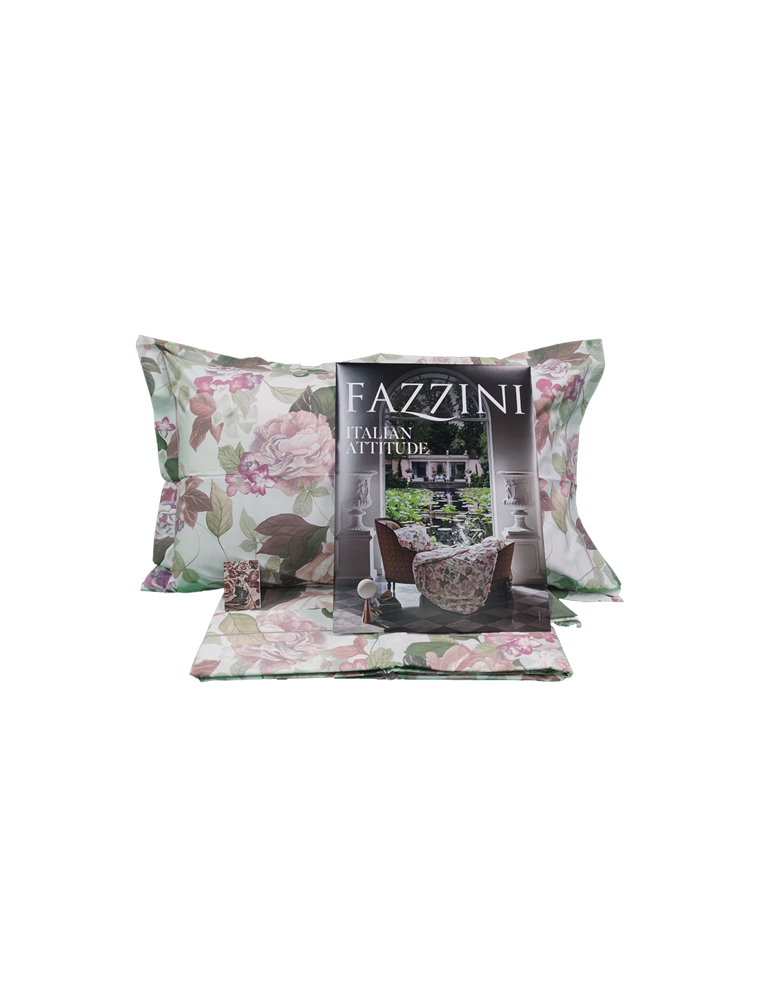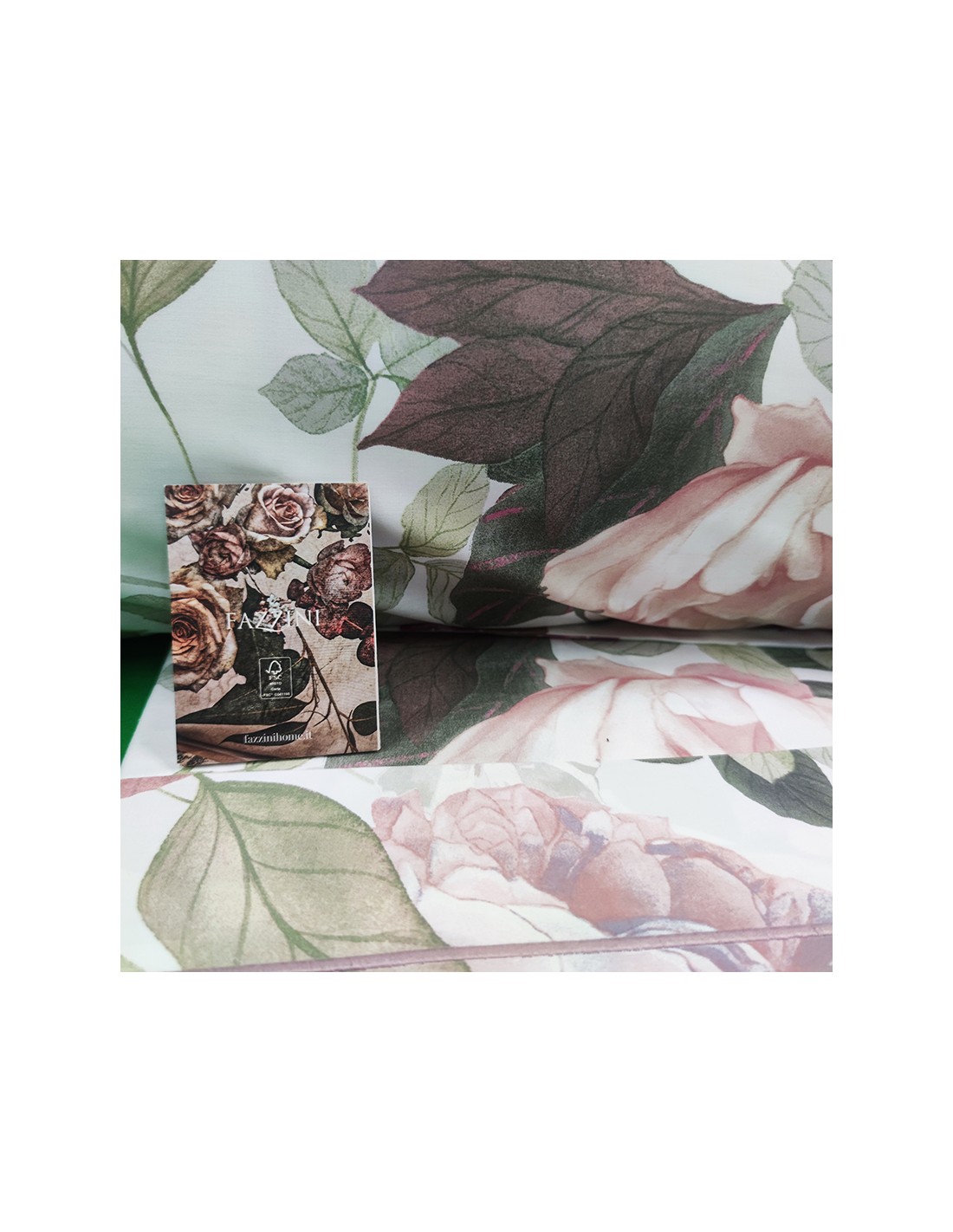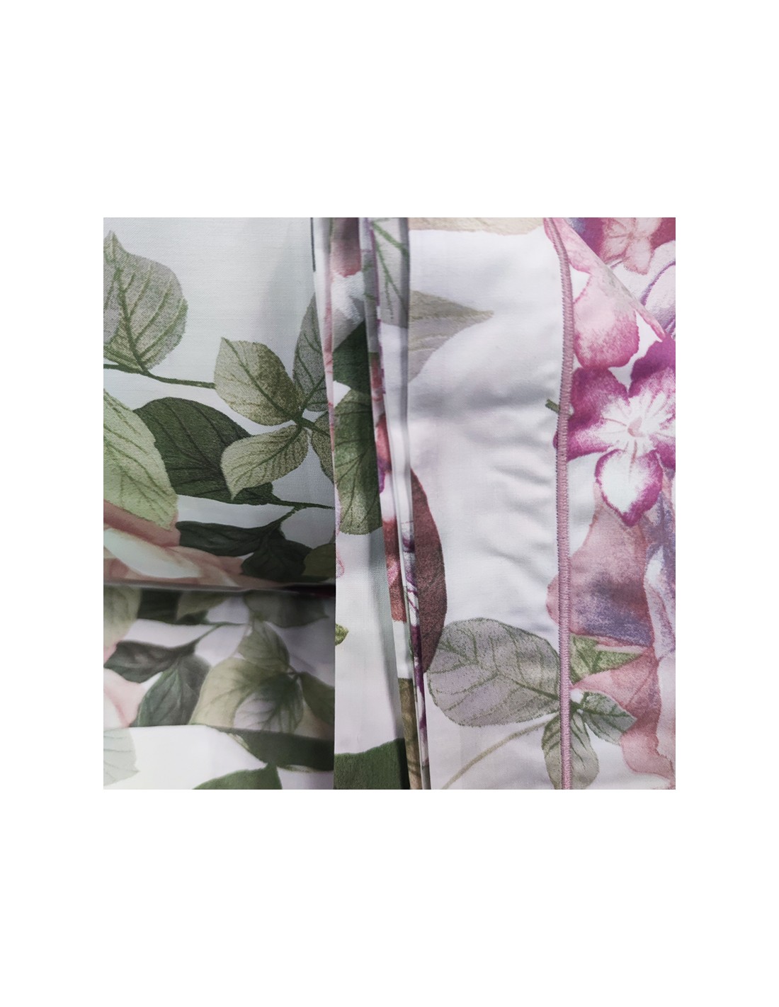Parure Matrimoniale Isola Bella in percalle di puro cotone stampato a 13 colori con sovrastampa in lacca bianca, fantasia Floreale sui toni del rosa e verde su sfondo bianco. Brand italiano Fazzini