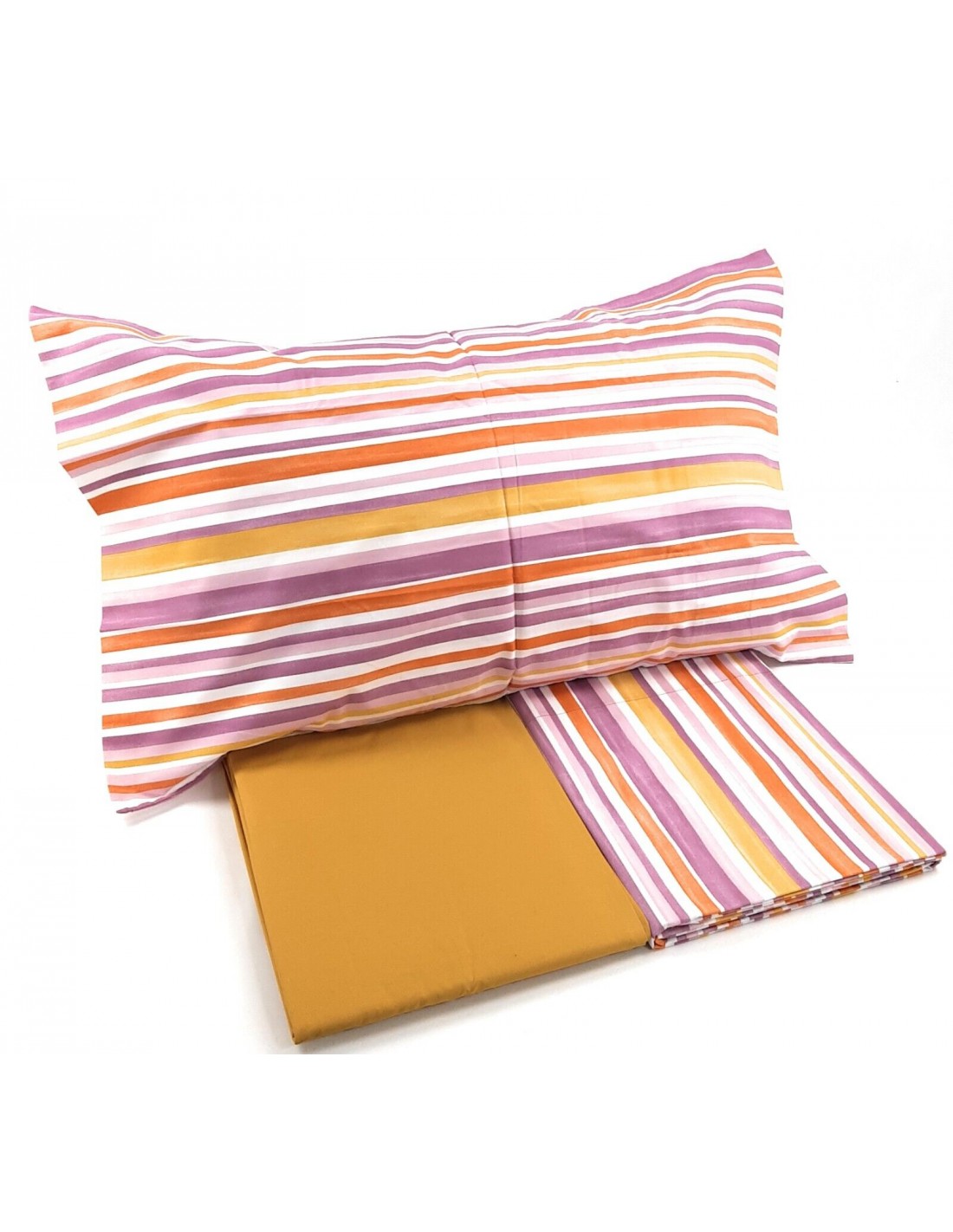 Completo lenzuola singolo Fazzini Tobago, in percalle di puro cotone. Il lenzuolo Tobago presenta una delicata fantasia con righe colorate. La fantasia è presente sulle federe e sulla faccia superiore del lenzuolo di sopra, entrambi in percalle di puro cotone. Il lenzuolo con angoli è in percalle tinta unita.