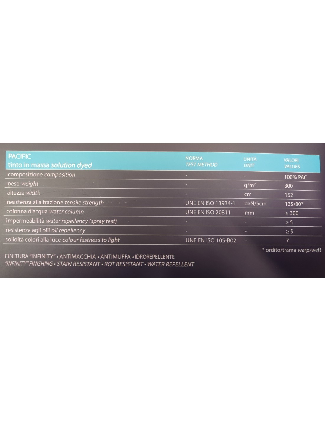 Pacific è un tessuto acrilico. Con il suo design "tinto in massa", i suoi colori sono particolarmente resistenti. Perfetti per la barca.