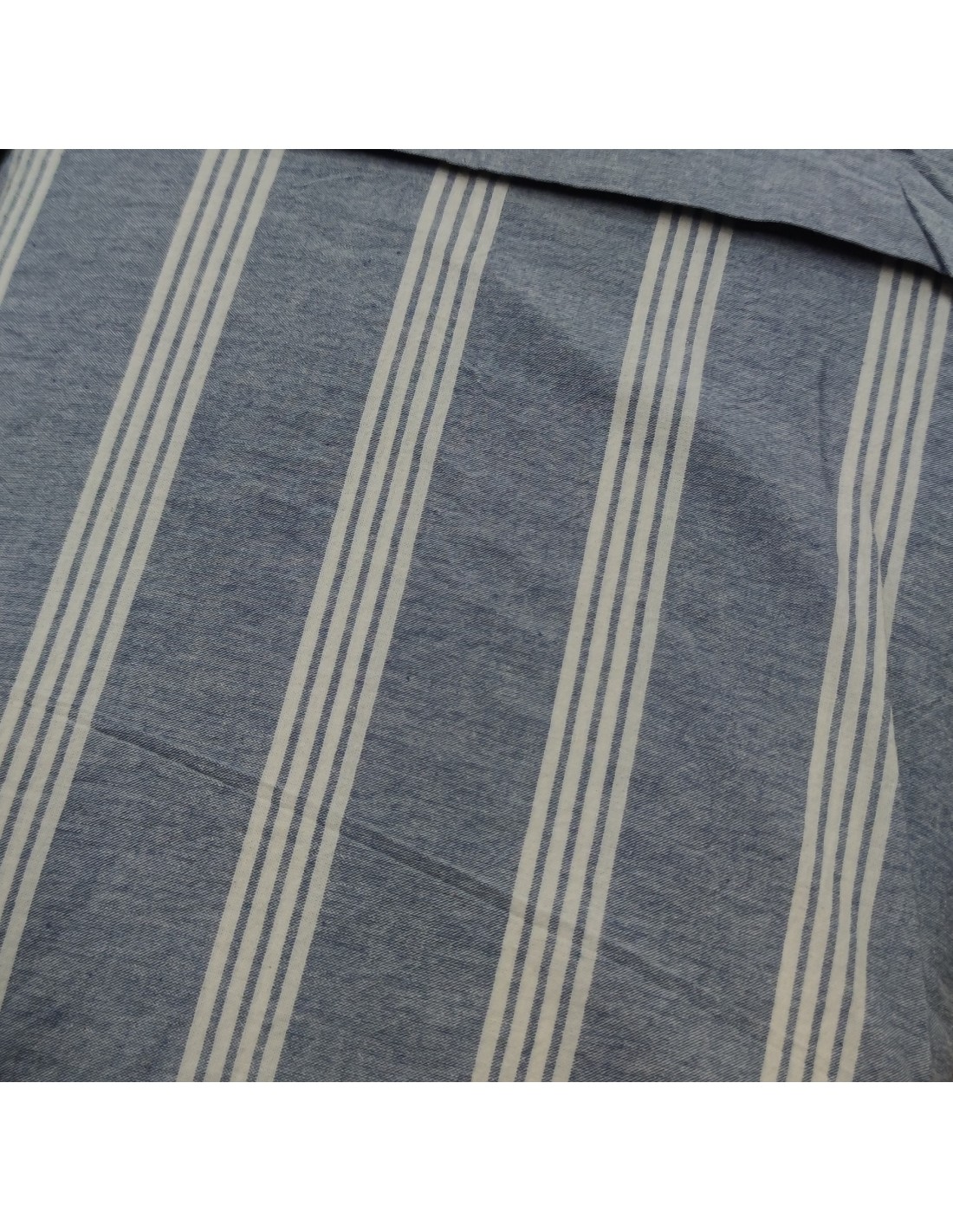 Completo Copripiumino rigato Matilde, in puro Cotone tinto filo con lavorazione no stiro sui colori del denim. il cotone tinto in filo "no stiro" è un particolare cotone lavabile in lavatrice, dall'effetto naturale e leggermente vissuto che gli conferisce un ottimo aspetto anche senza l'uso del ferro da stiro. brand italiano Jolie Firenze, by Cavalieri.