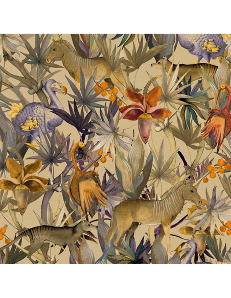Design Double Face: Da un lato la ricca fantasia Folliage con Animali, e dall'altro un disegno geometrico elegante (probabilmente in colore a contrasto) per variare l'arredo.