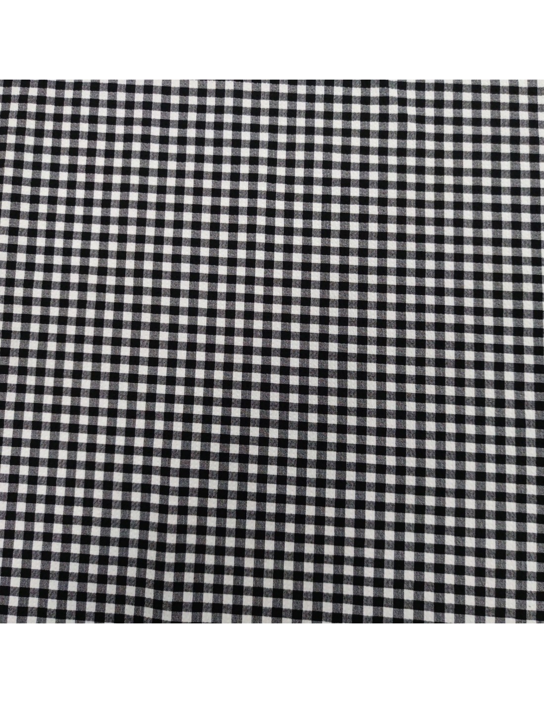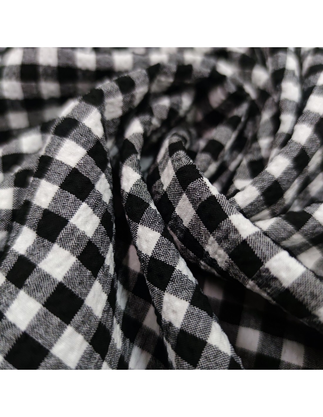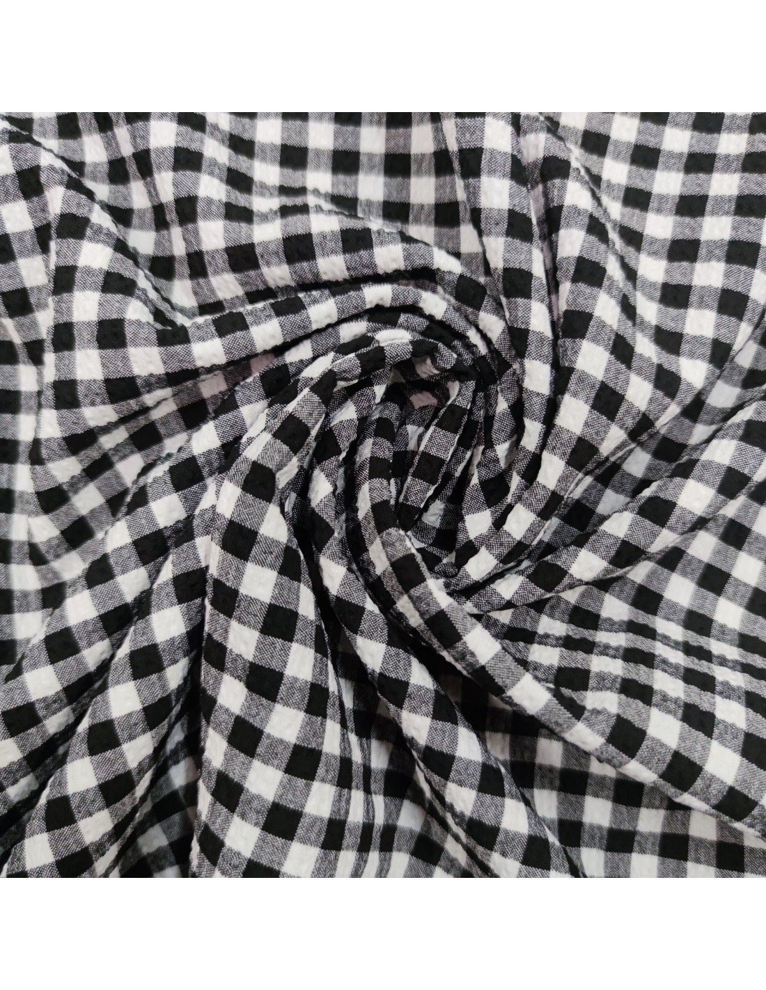 Tessuto misto cotone, poliestere ed elastan con lavorazione goffrata, fantasia a quadretti piccola bianca e nera.