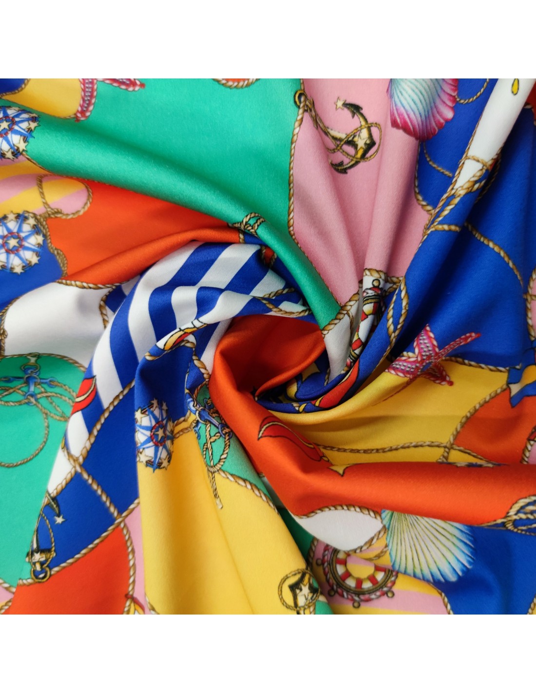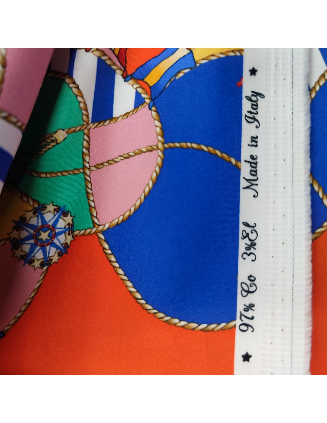 Cotone elasticizzato con lavorazione a Raso, fantasia multicolor con inserti marinari. Morbidissimo e fresco al tatto. Disegno dell'alta moda italiana. Ottimo per la stagione Primavera / Estate