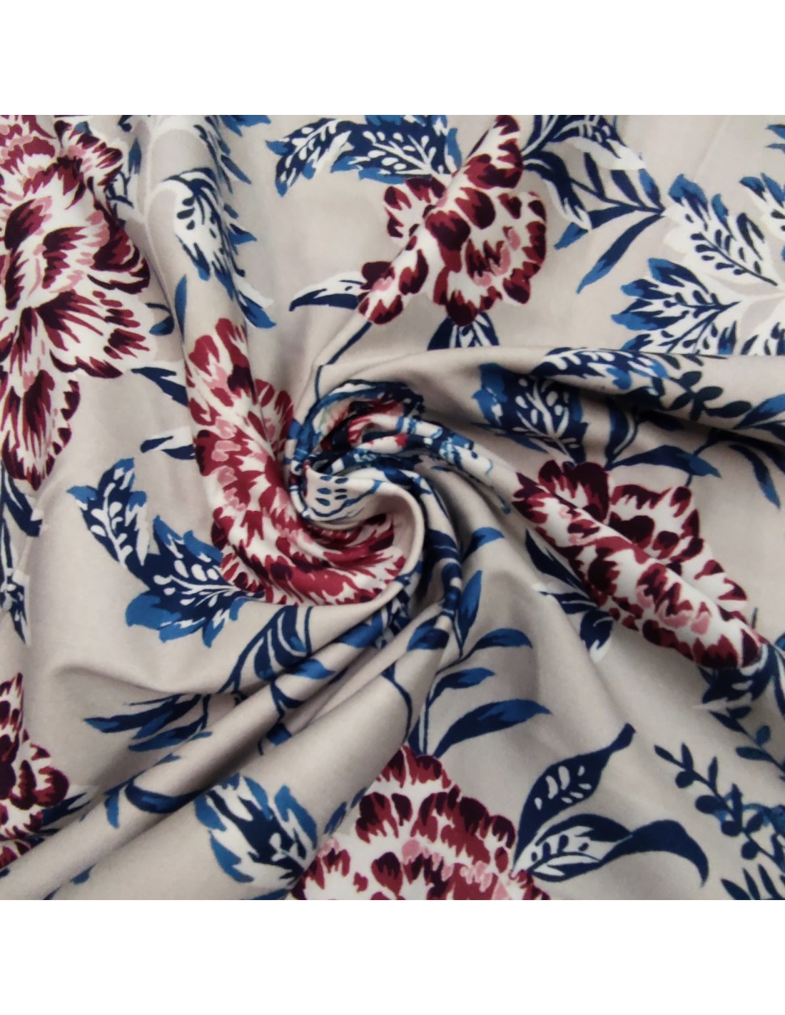 Tessuto in Cotone elasticizzato con lavorazione a rasatello, fantasia Floreale sui toni del bordeaux, bianco, rosa e blu su sfondo grigio. Molto morbido e fresco al tatto. Ottimo per la stagione Primavera / Estate.