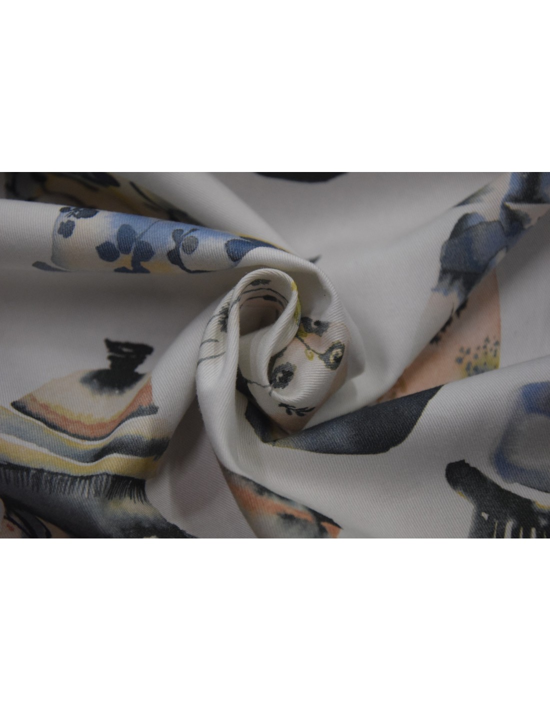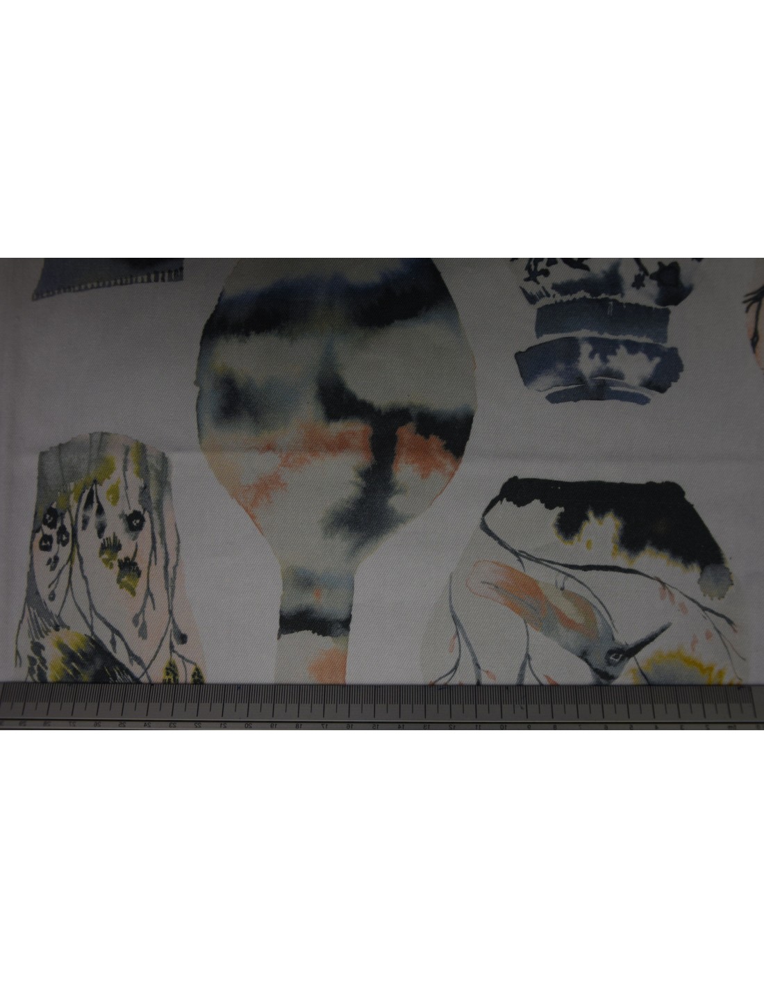 Tessuto in puro cotone stampato "Haiku". Il disegno riprende dei vasi sullo stile giapponese su uno sfondo bianco del Brand italiano Premium Interior, By Croce's collection ottimo per realizzare arredi letto, coperture per divani, cuscini e decorazioni
