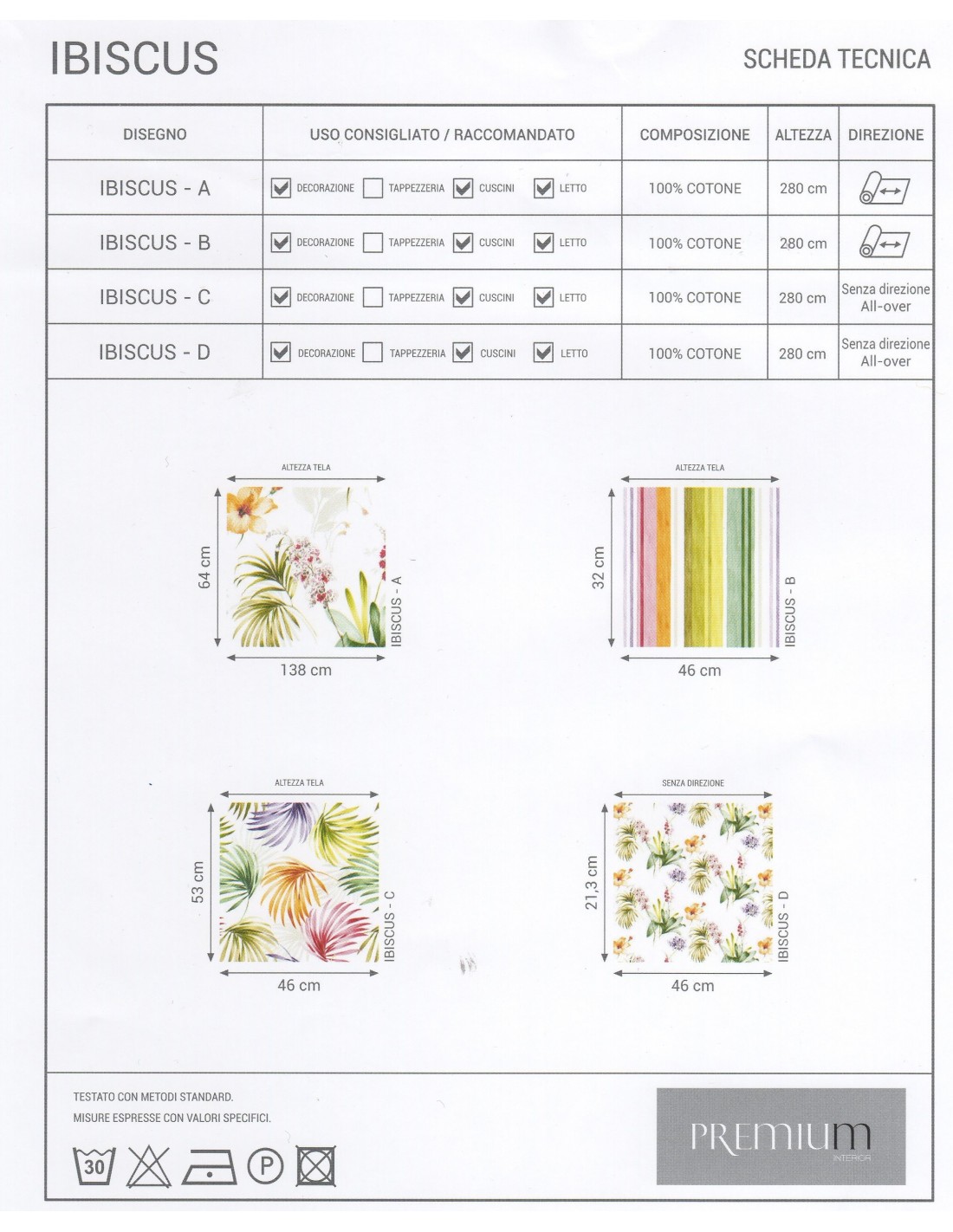 Tessuto in puro cotone in fantasia collezione "Ibiscus". Disegno Floreale stampato del Brand italiano Premium Interior, By Croce's collection ottimo per realizzare arredi letto, coperture per divani, cuscini e decorazioni
