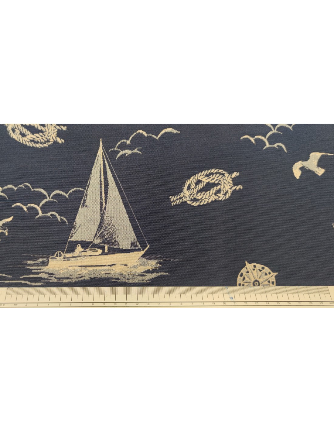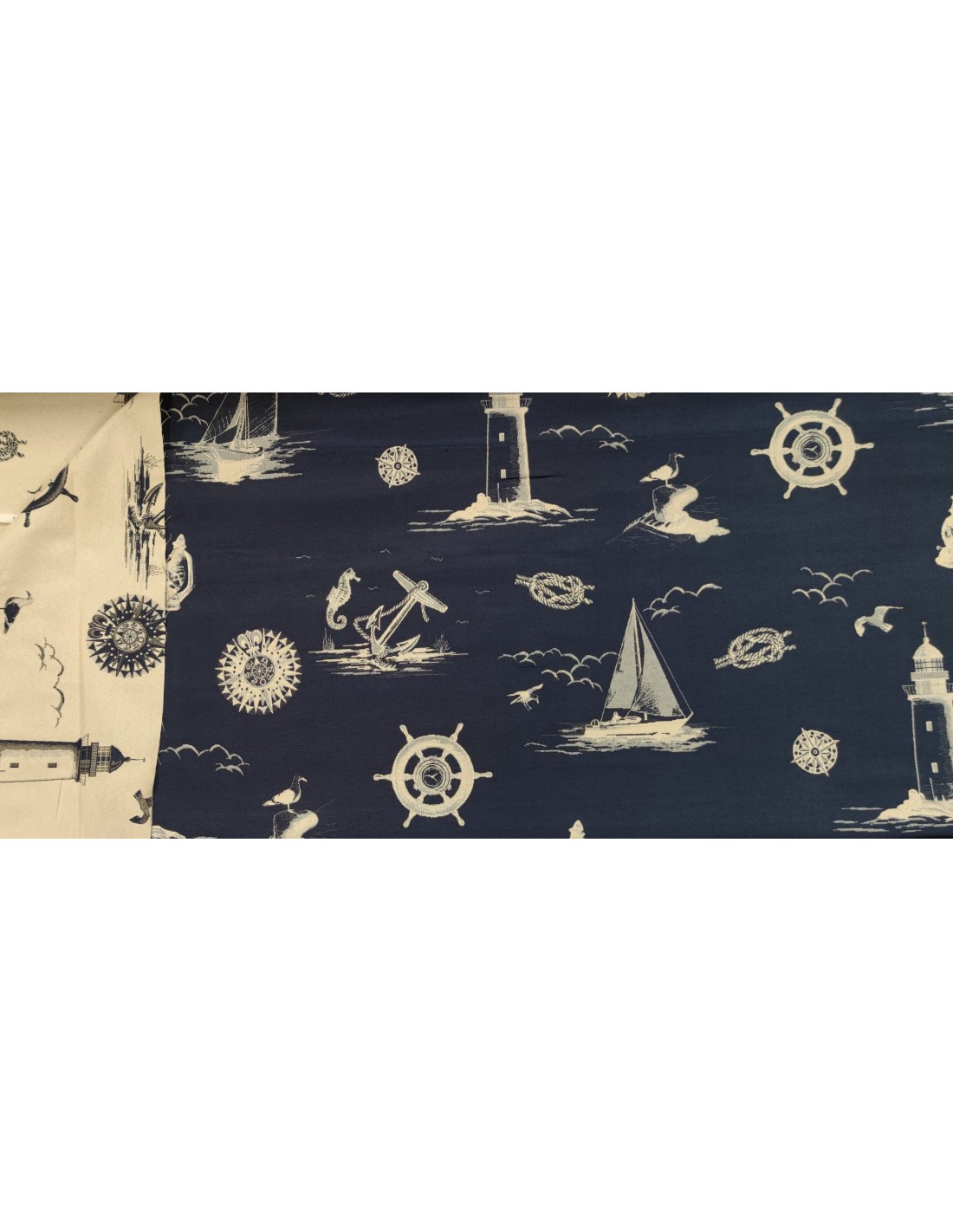 Tessuto d'arredamento in misto cotone, con fantasia marinara blu e panna e lavorazione jacquard doubleface .