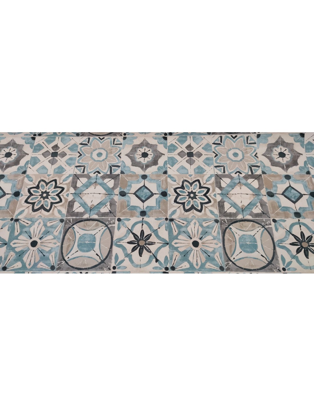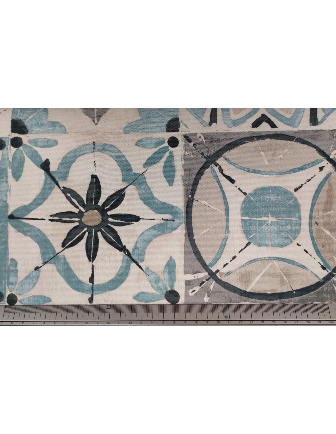 Tessuto stampato con fantasia a mattonelle sui toni del panna, blu, azzurro e grigio in poliestere con lavorazione a panama
