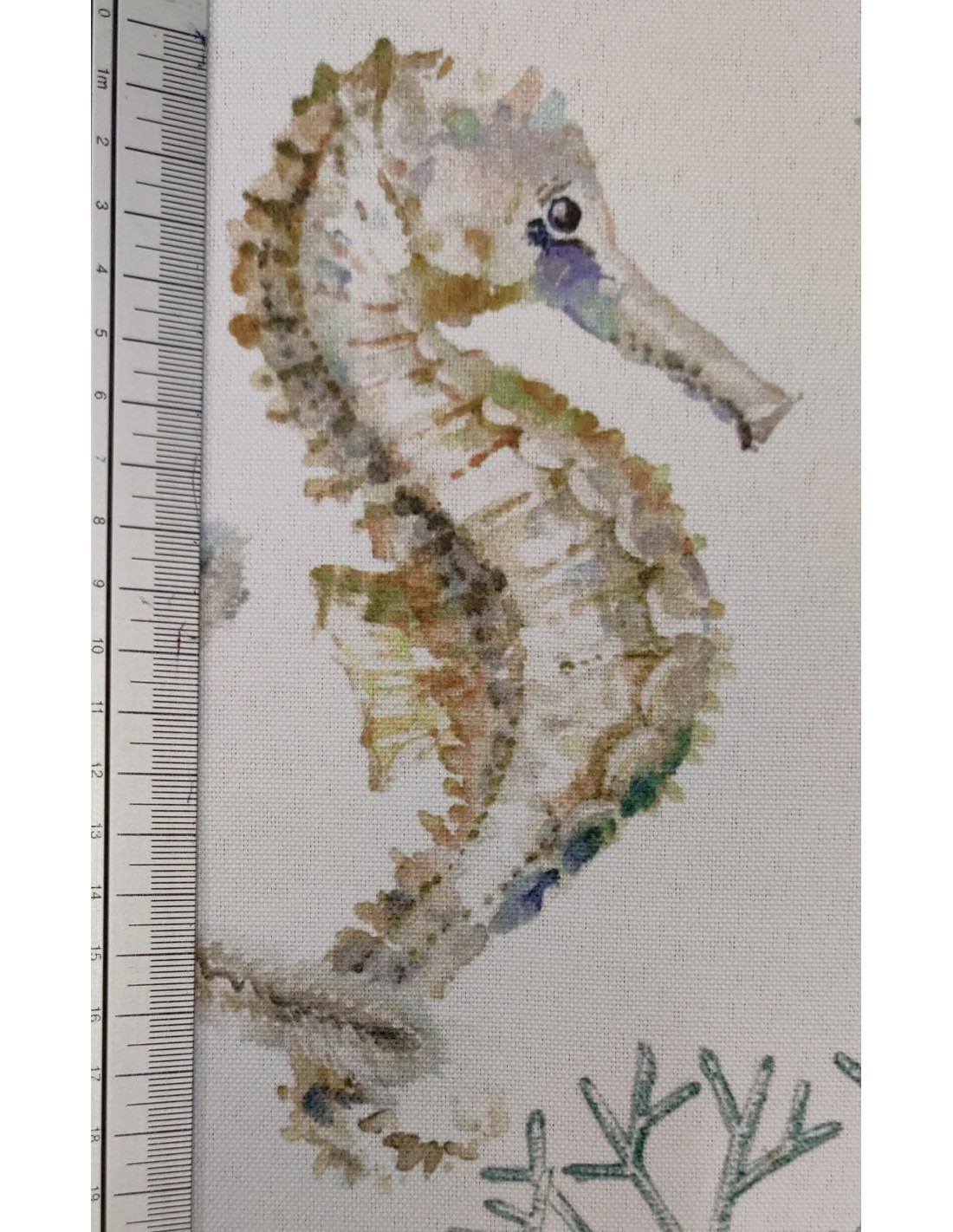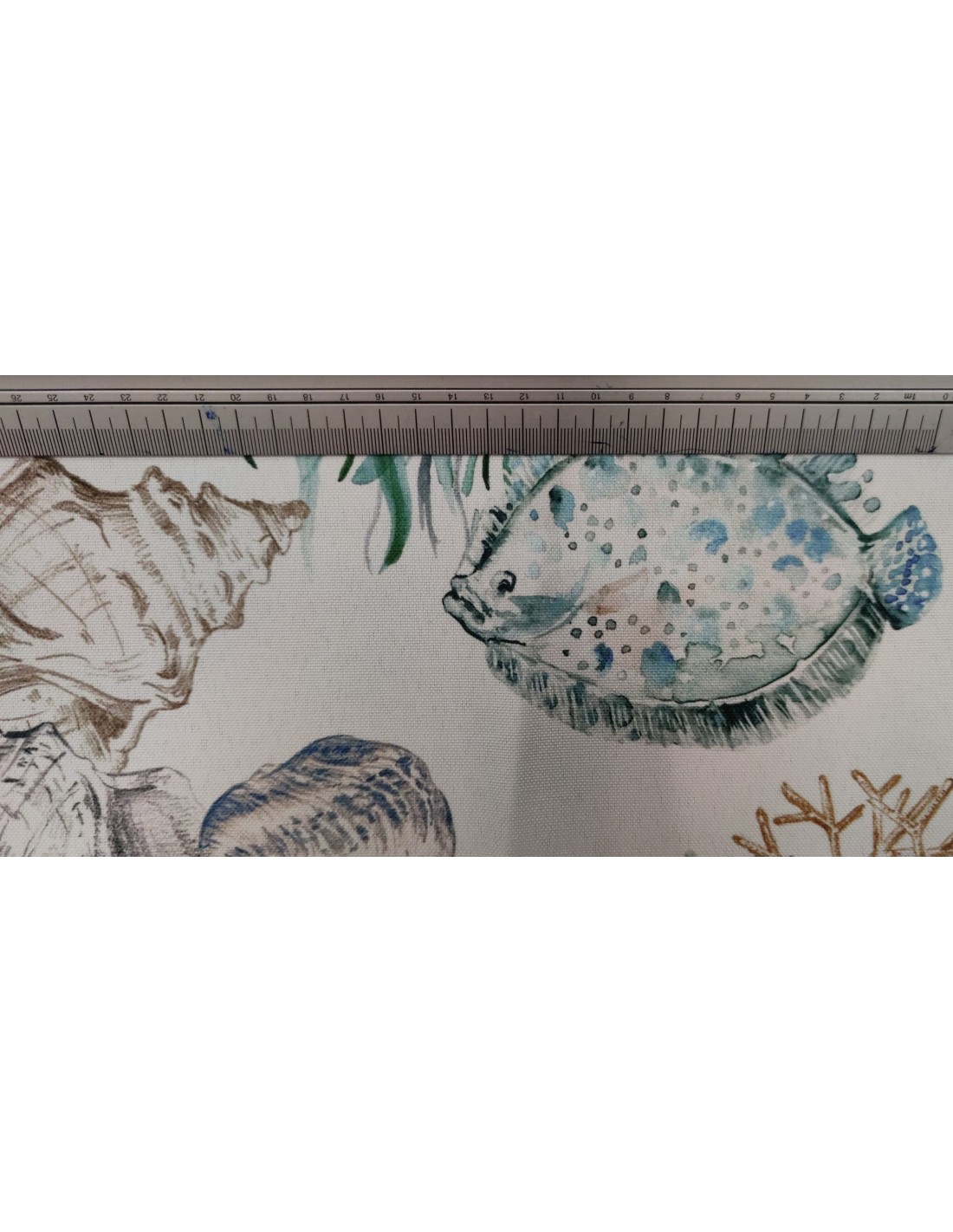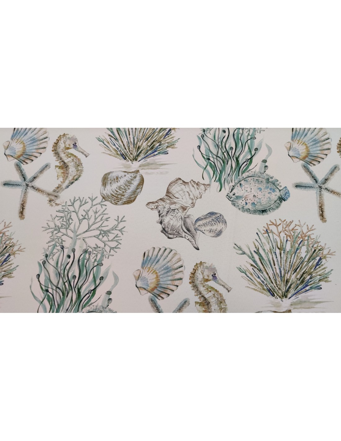 Tessuto stampato con fantasia marinara sui toni del verde, azzurro, giallo e panna in poliestere con lavorazione a panama
