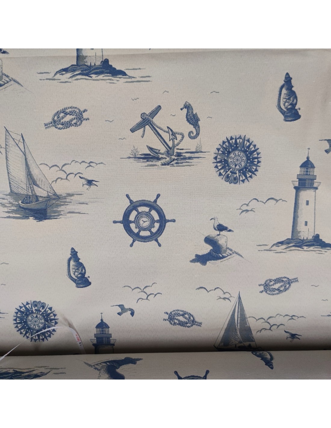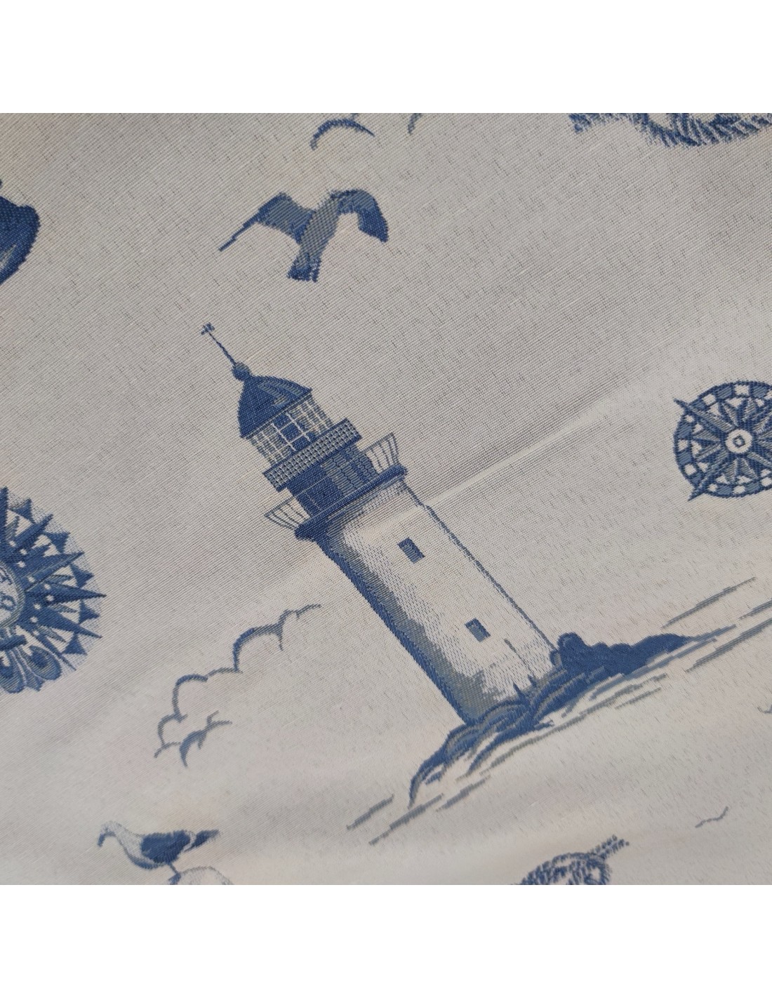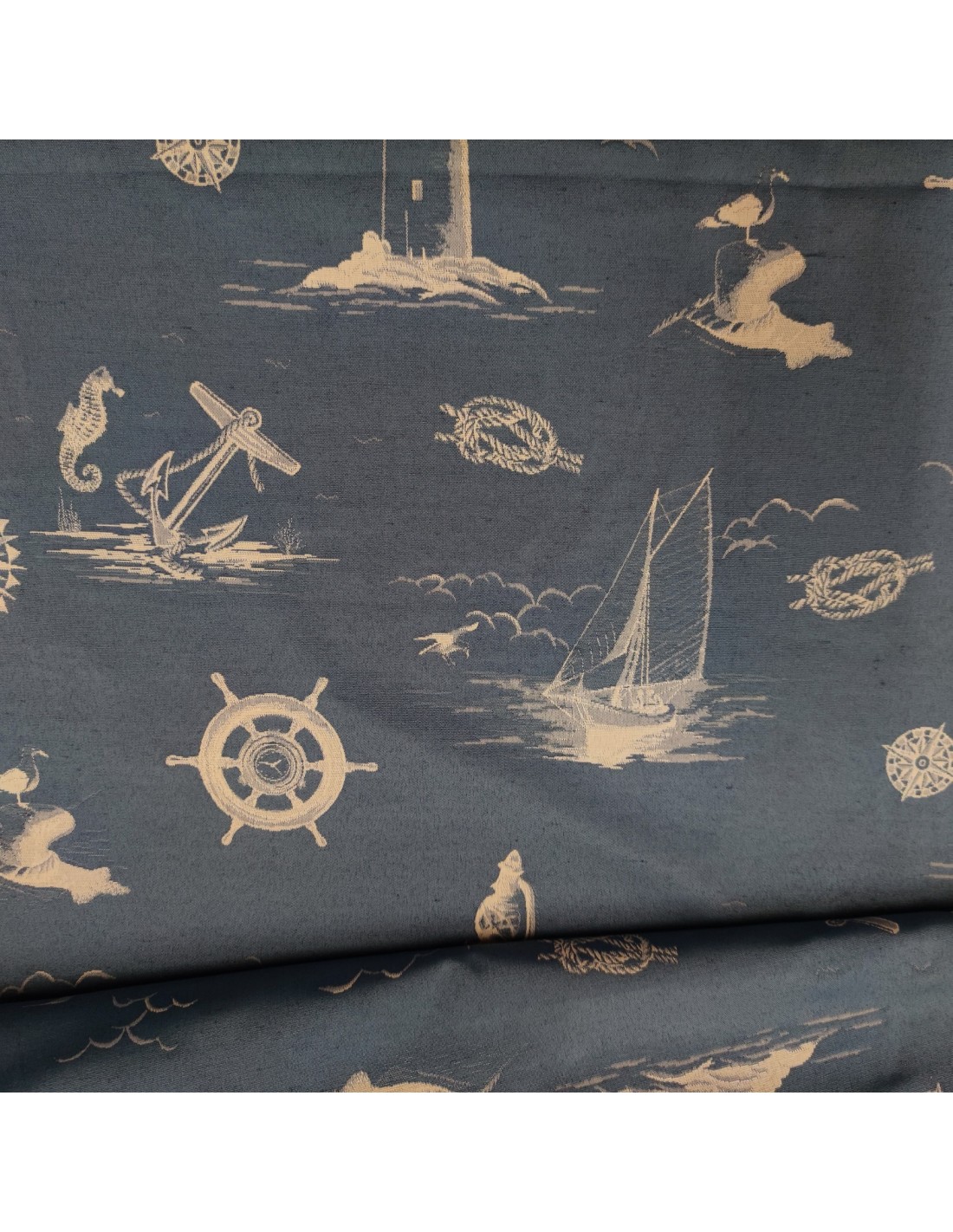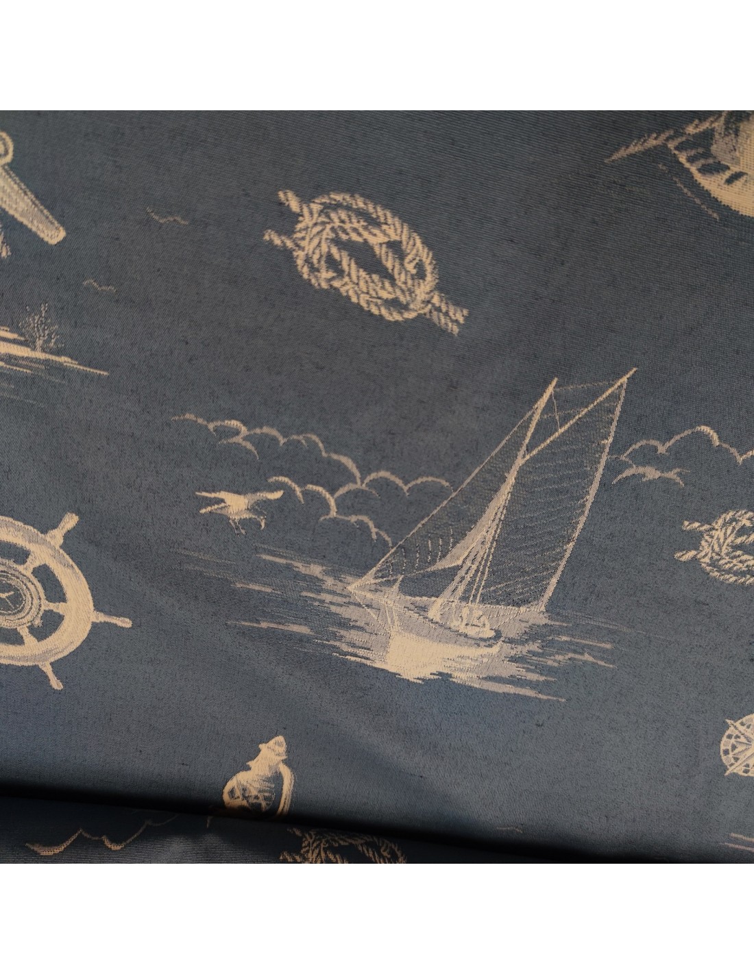 Tessuto d'arredamento in misto cotone, con fantasia marinara color azzurro jeans e panna e lavorazione jacquard doubleface .