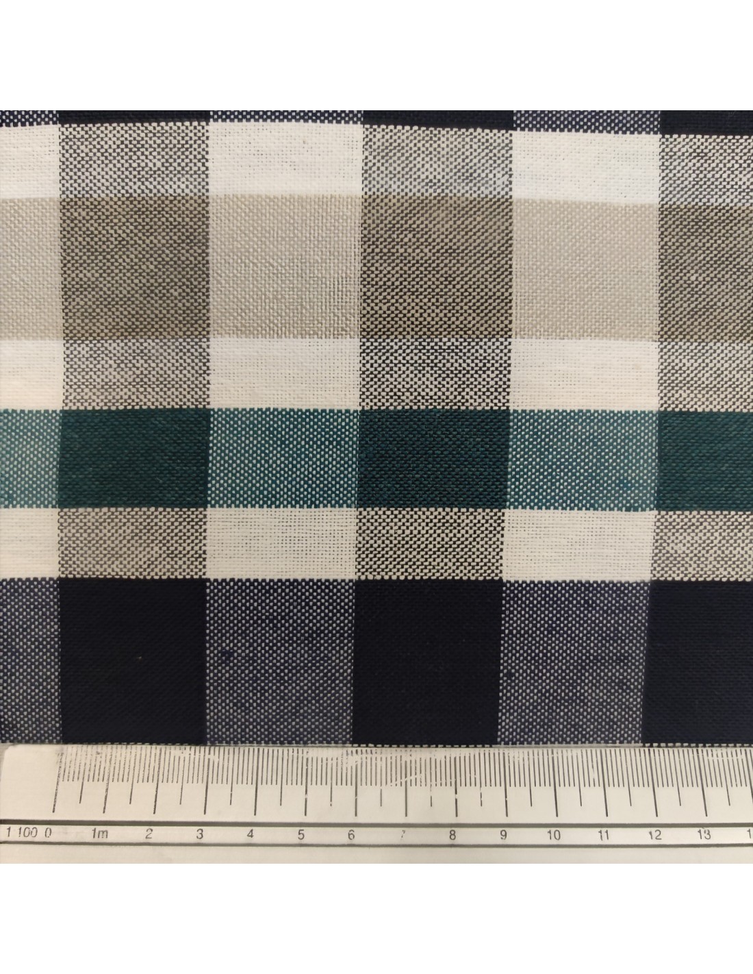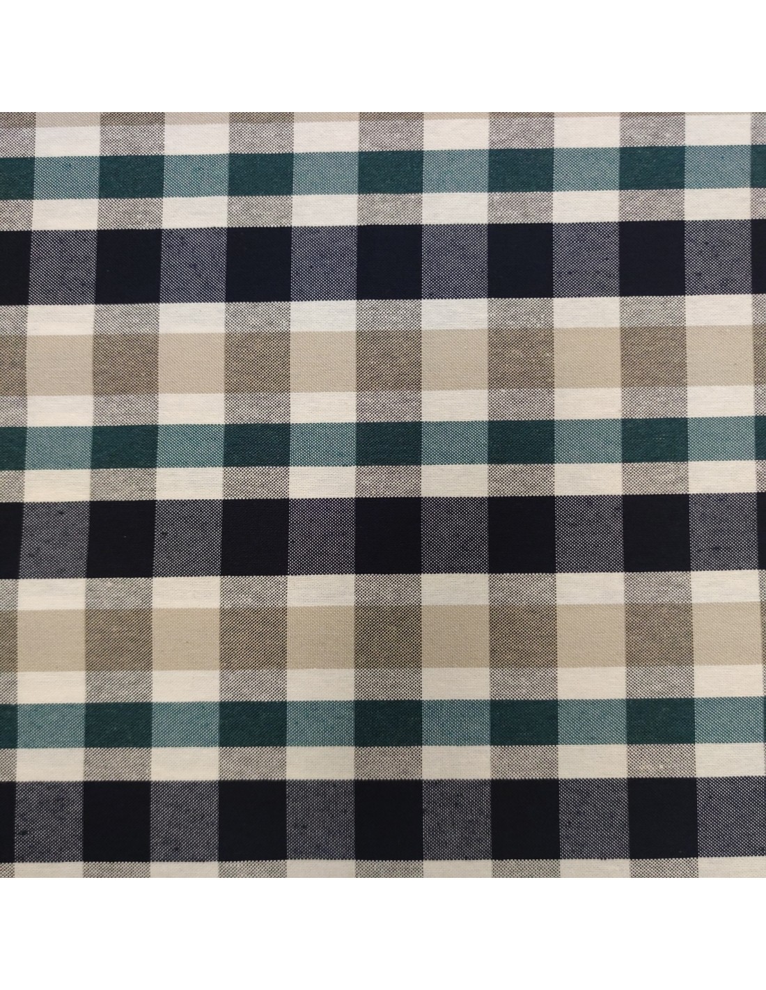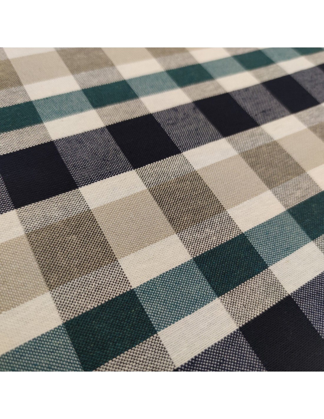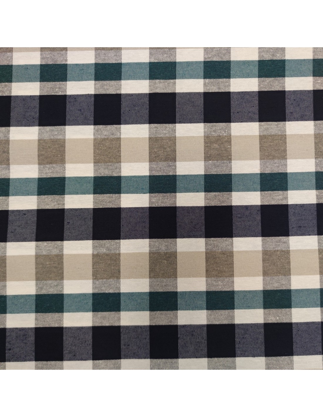 Tessuto in misto cotone con lavorazione a cretonne, fantasia scozzese del blu, verde e beige su sfondo bianco