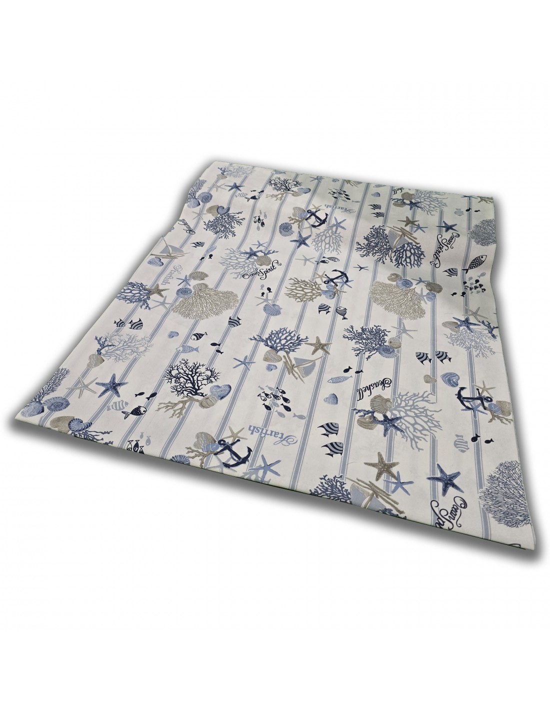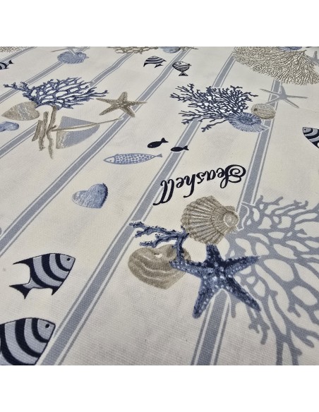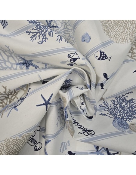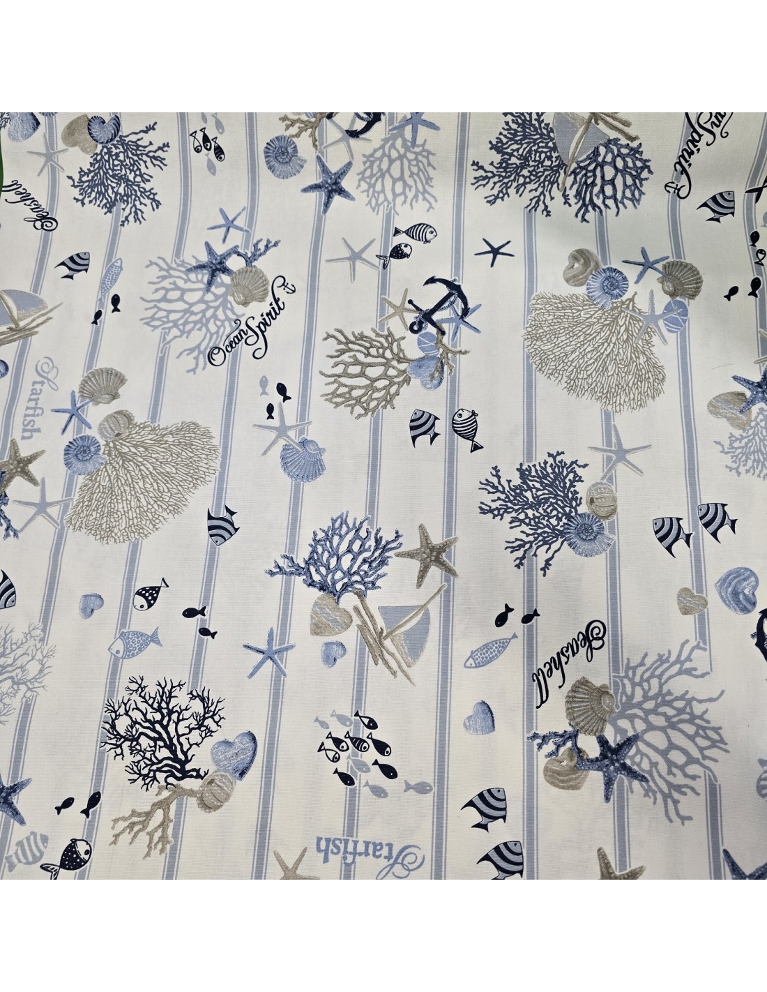 Tessuto PANAMA in 100% Puro Cotone, leggero (215 gr/mq) e fresco, con una delicata fantasia a tema marittimo (coralli, pesci e conchiglie) su fondo bianco a righe azzurre. Perfetto per tovaglie, cuscini e decorazioni estive. Altezza standard 140 cm.