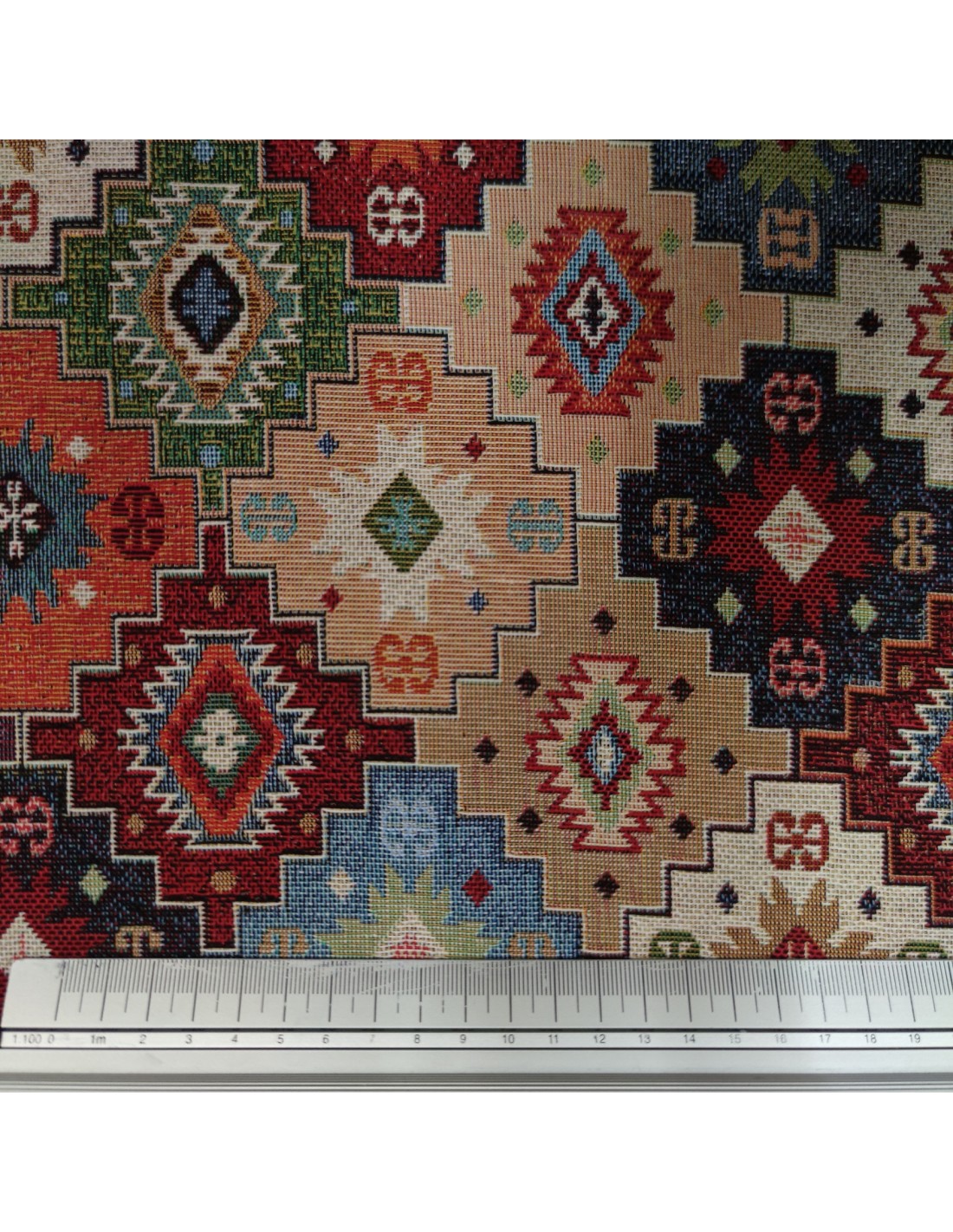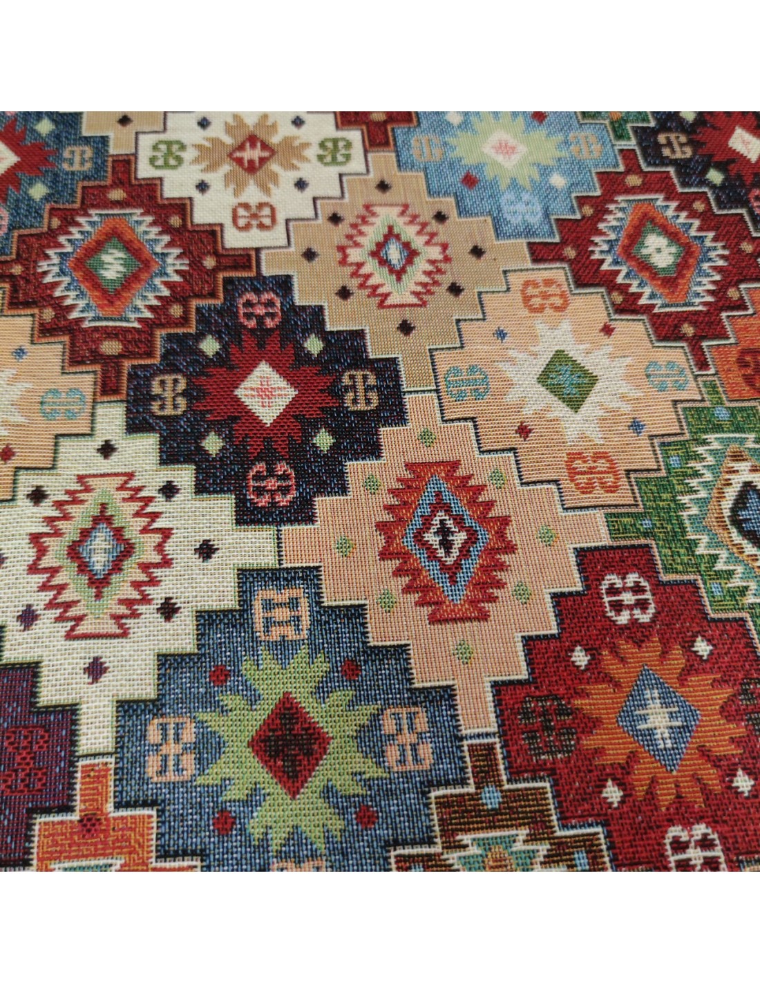 Tessuto Gobeline Santillana in misto cotone (60% Cotone - 40% Poliestere) con una vivace fantasia geometrica in stile etnico. Ideale per dare un tocco esotico e di carattere ai tuoi interni. Altezza 280 cm.