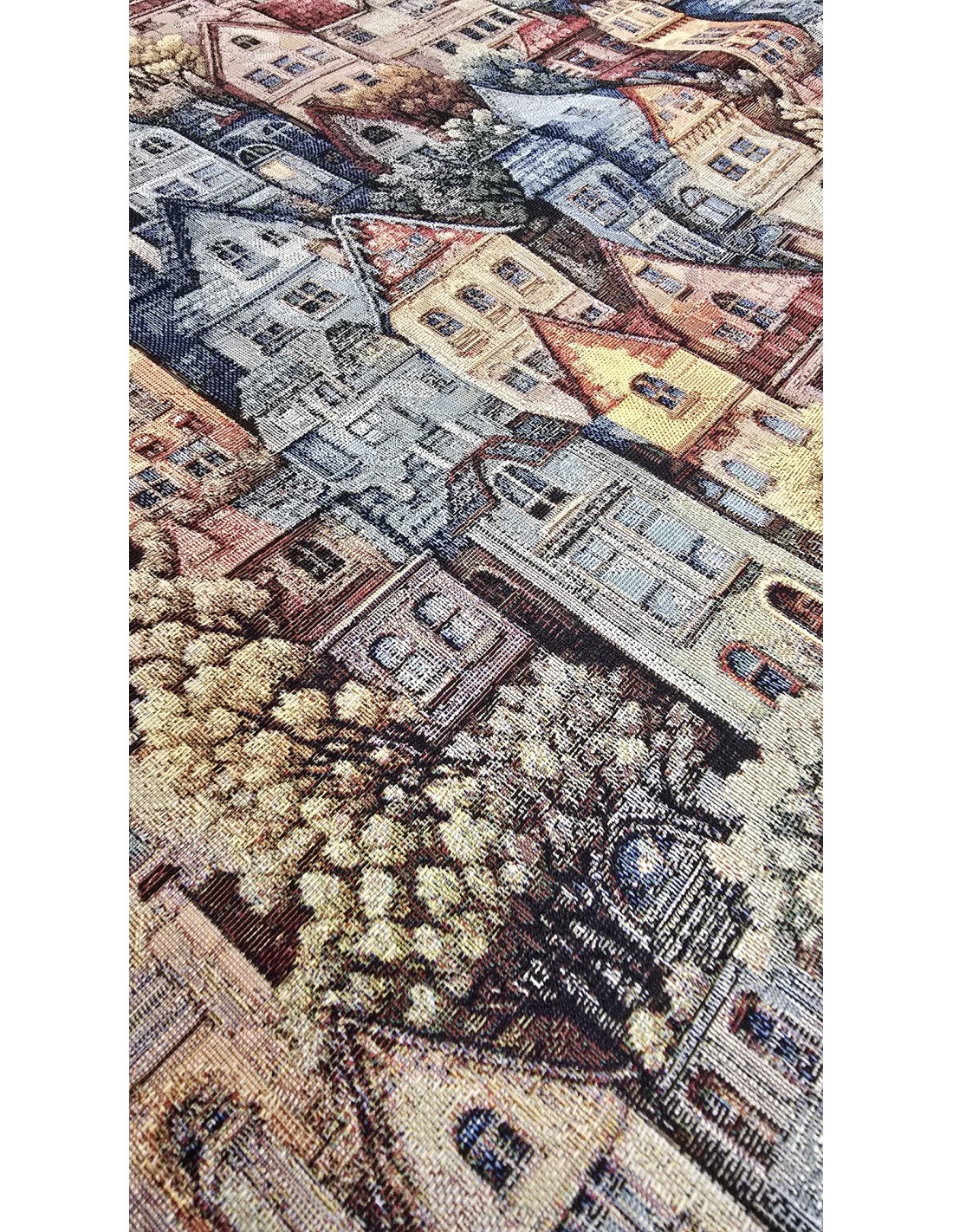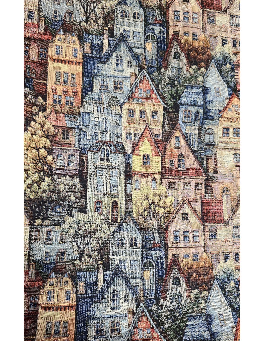 Porta l'atmosfera pittoresca di un borgo europeo direttamente nei tuoi interni. Questo Gobelin unico vanta una fantasia ricca e dettagliata che ricorda un antico arazzo o un dipinto a olio, con case accatastate e alberi stilizzati in tonalità sfumate. È la scelta perfetta per creare un ambiente caldo, accogliente e pieno di carattere, ideale per chi ama l'arredo che racconta una storia.