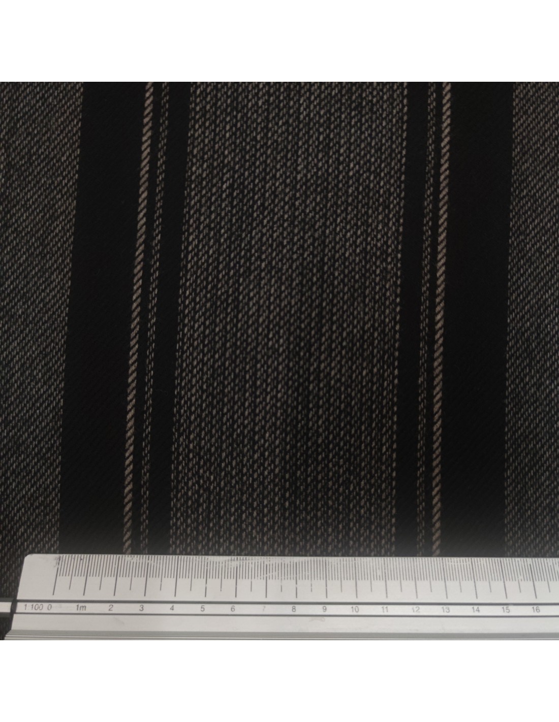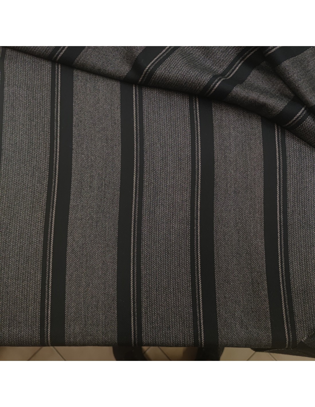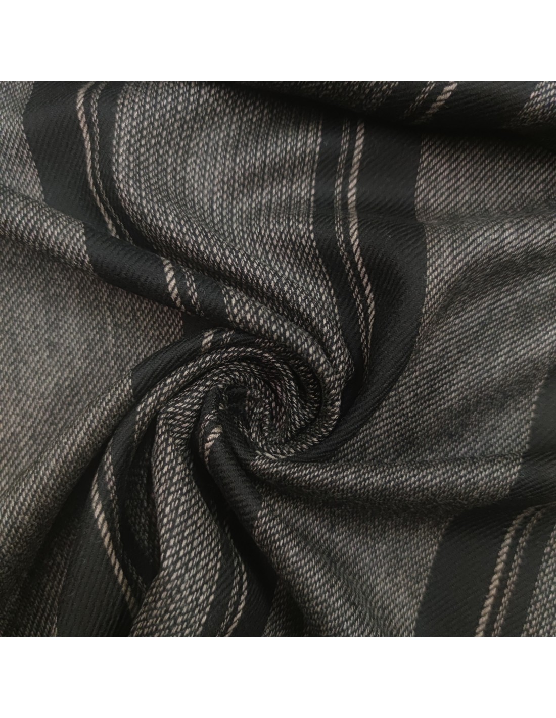 Tessuto in pura lana vergine con lavorazione a Saglia, fantasia rigata sui toni del beige su fondo nero