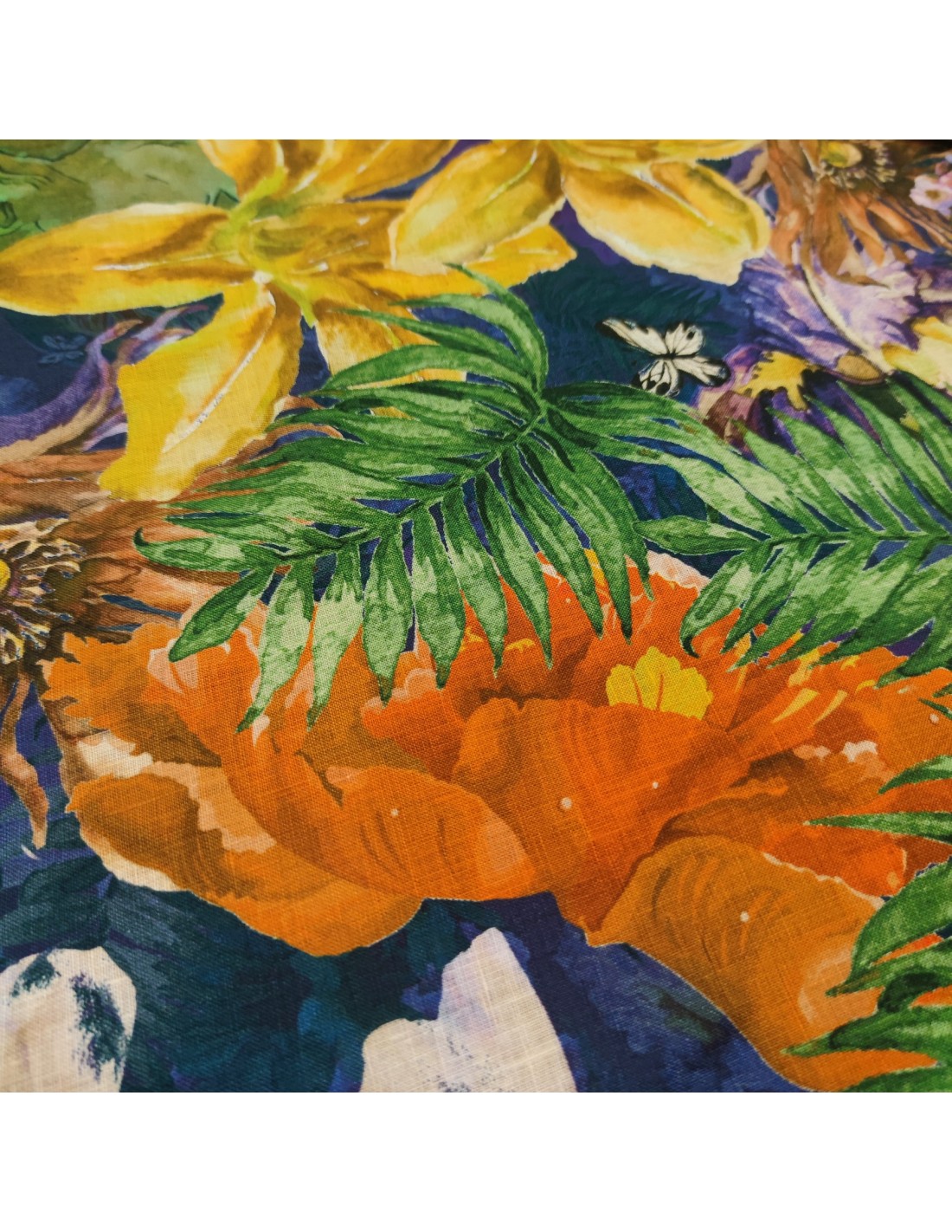 Morbido e fresco puro lino stampato in fantasia floreale sui toni del blu, giallo, arancione, verde, glicine, avorio, e marrone. Tessuto dell'alta moda italiana