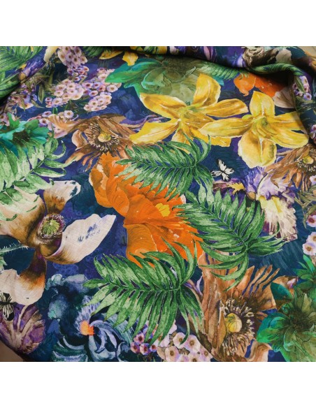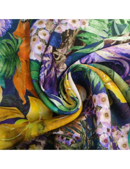 Morbido e fresco puro lino stampato in fantasia floreale sui toni del blu, giallo, arancione, verde, glicine, avorio, e marrone. Tessuto traspirante e fresco molto piacevole a contatto con la pelle. Tessuto dell'alta moda italiana.