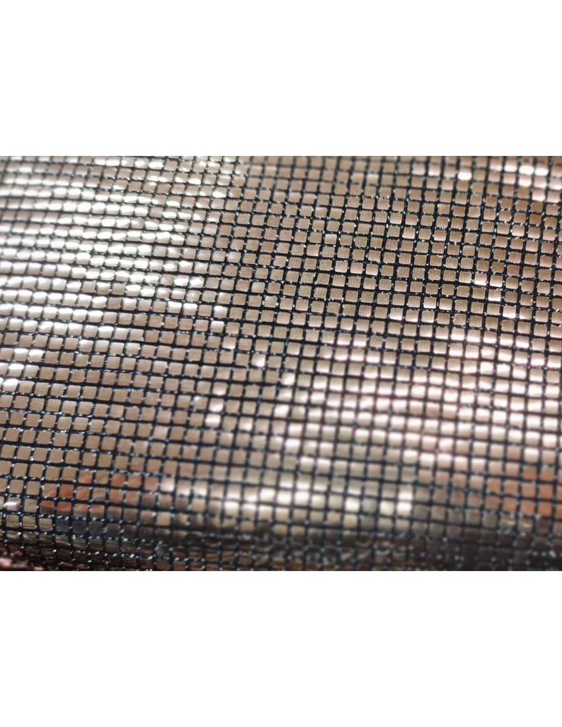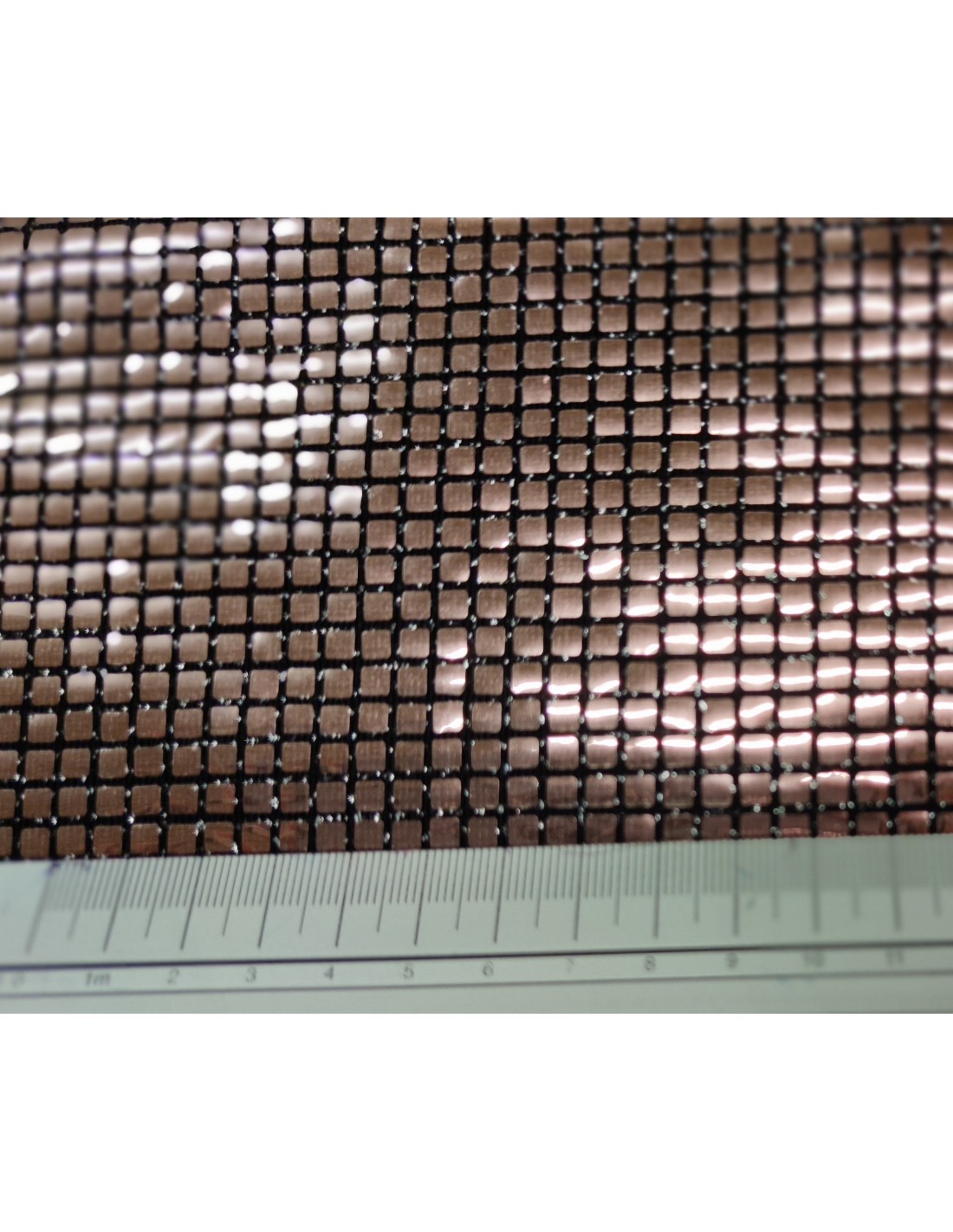 Tessuto in poliestere con lavorazione a Paillettes color rame o argento a quadrate su maglina nera. Elegante e con un ottima caduta.