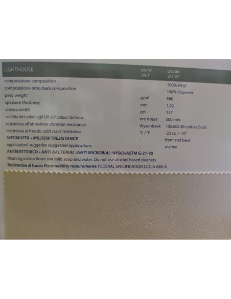Materiale: spalmatura 100% vinile, supporto 100% poliestere