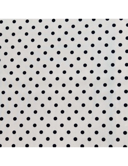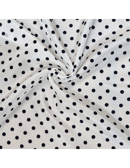 Tessuto in poliestere con lavorazione a crepe de chine, fantasia a pois nero da 7mm su sfondo bianco , molto morbido al tatto.