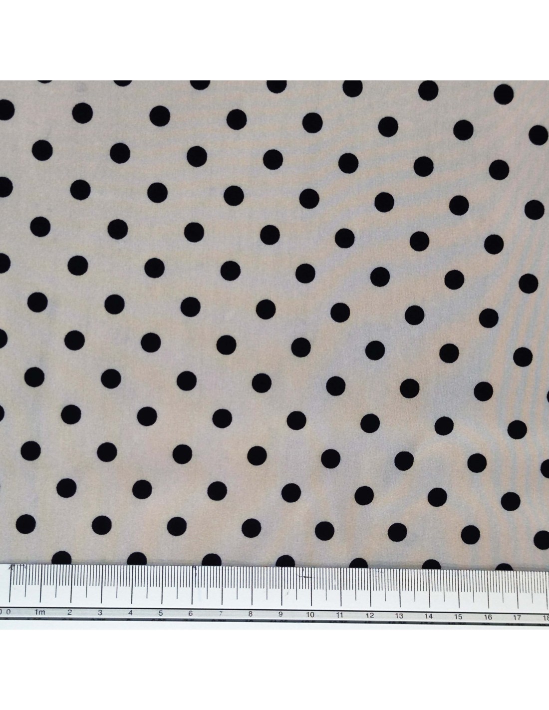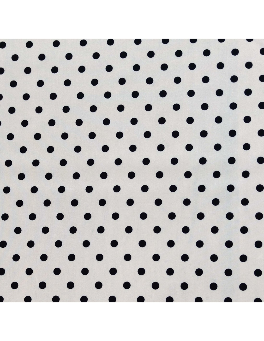 Tessuto in poliestere con lavorazione a crepe de chine, fantasia a pois nero da 7mm su sfondo bianco e riga bianca, molto morbido al tatto.