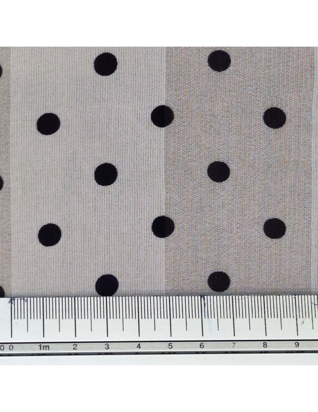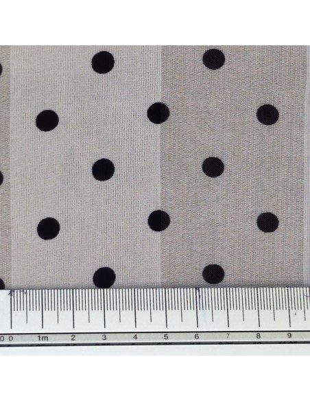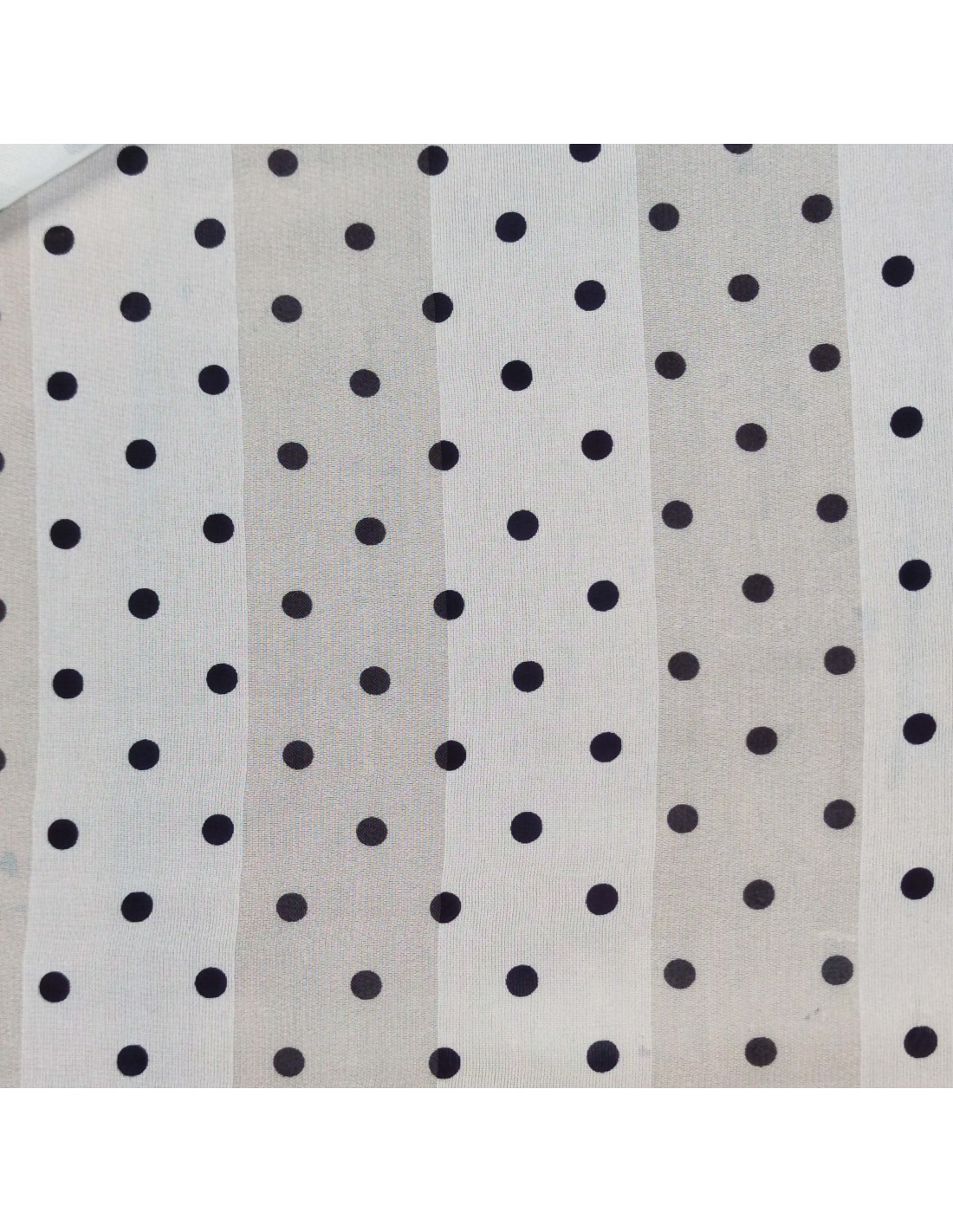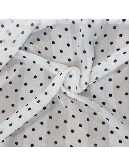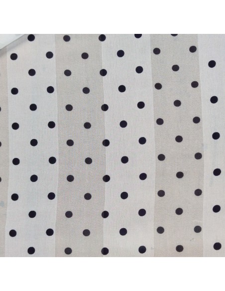 Tessuto in Poliestere con lavorazione a chiffon, fantasia a pois nero da 7mm su sfondo bianco e riga bianca, molto morbido al tatto. Firmato Enrico Coveri.