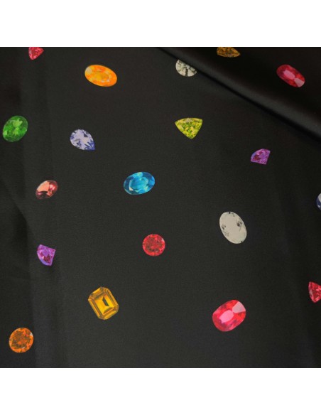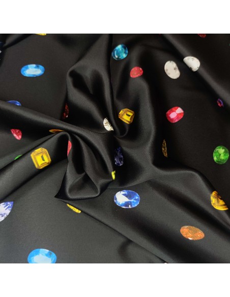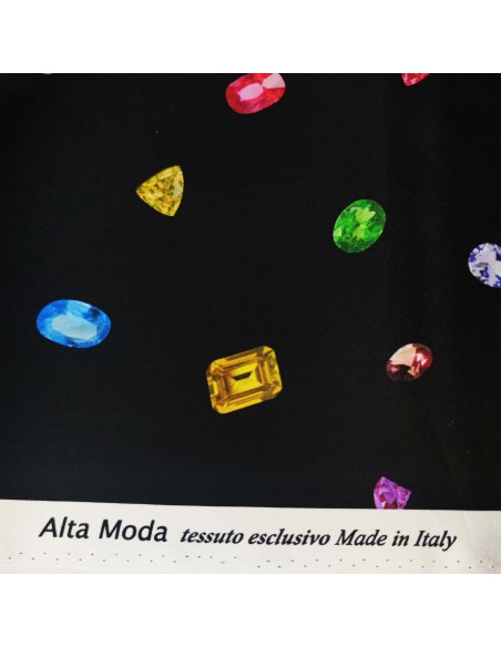 Tessuto dell'Alta moda italiana di Seta Elasticizzata con lavorazione a raso in fantasia raffigurante delle pietre preziose colorate su sfondo nero. Molto morbido alla mano con un'ottima caduta.
