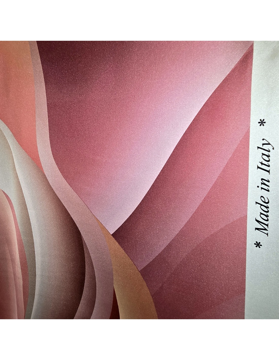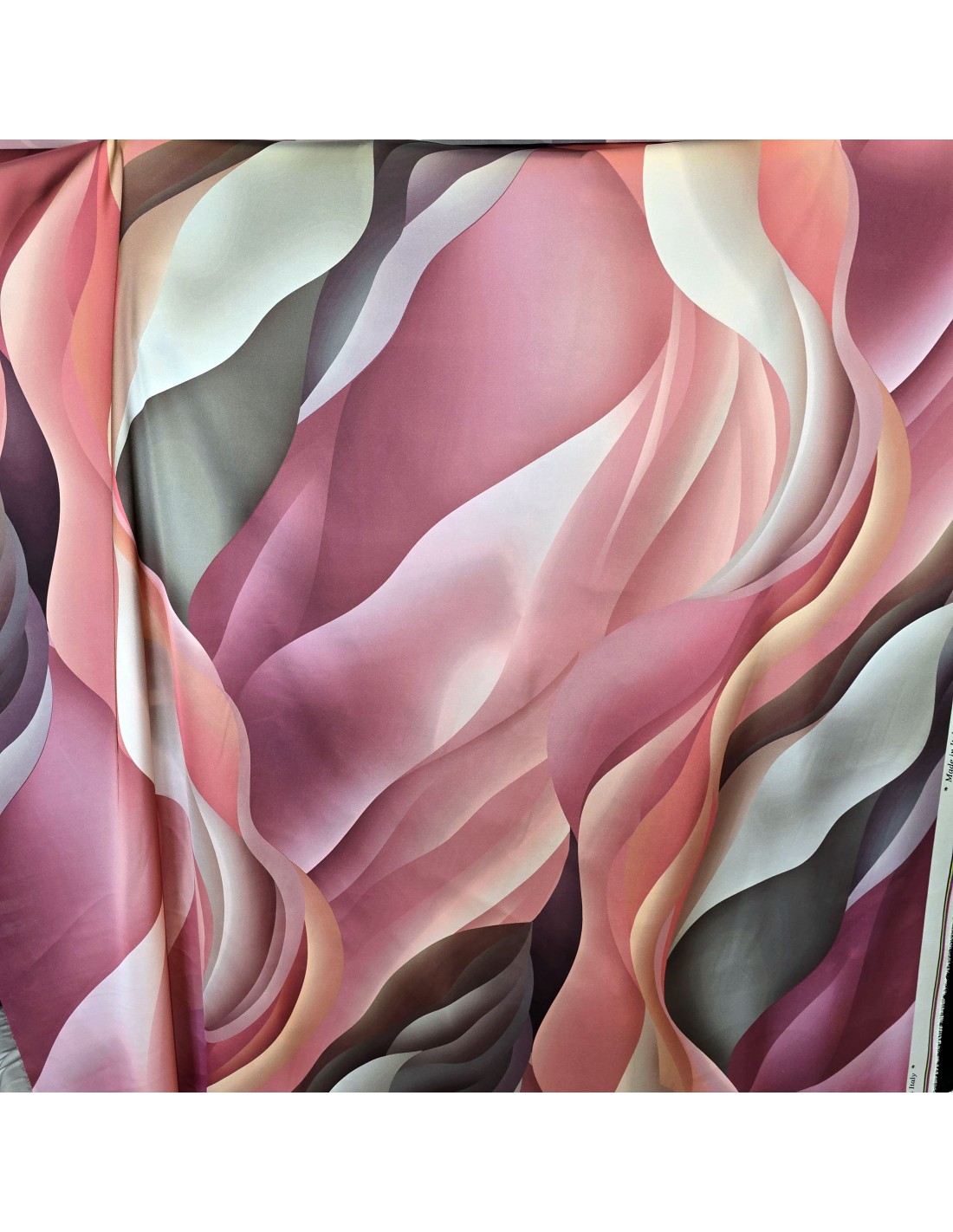 Tessuto in poliestere con lavorazione a Raso Satin mano seta in fantasia in stampa digitale sfumata sui toni del rosa, grigio, marrone, tortora e bordeaux. Tessuto morbidissimo al tatto con un ottima caduta