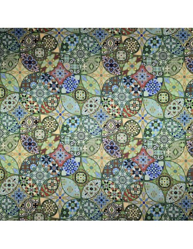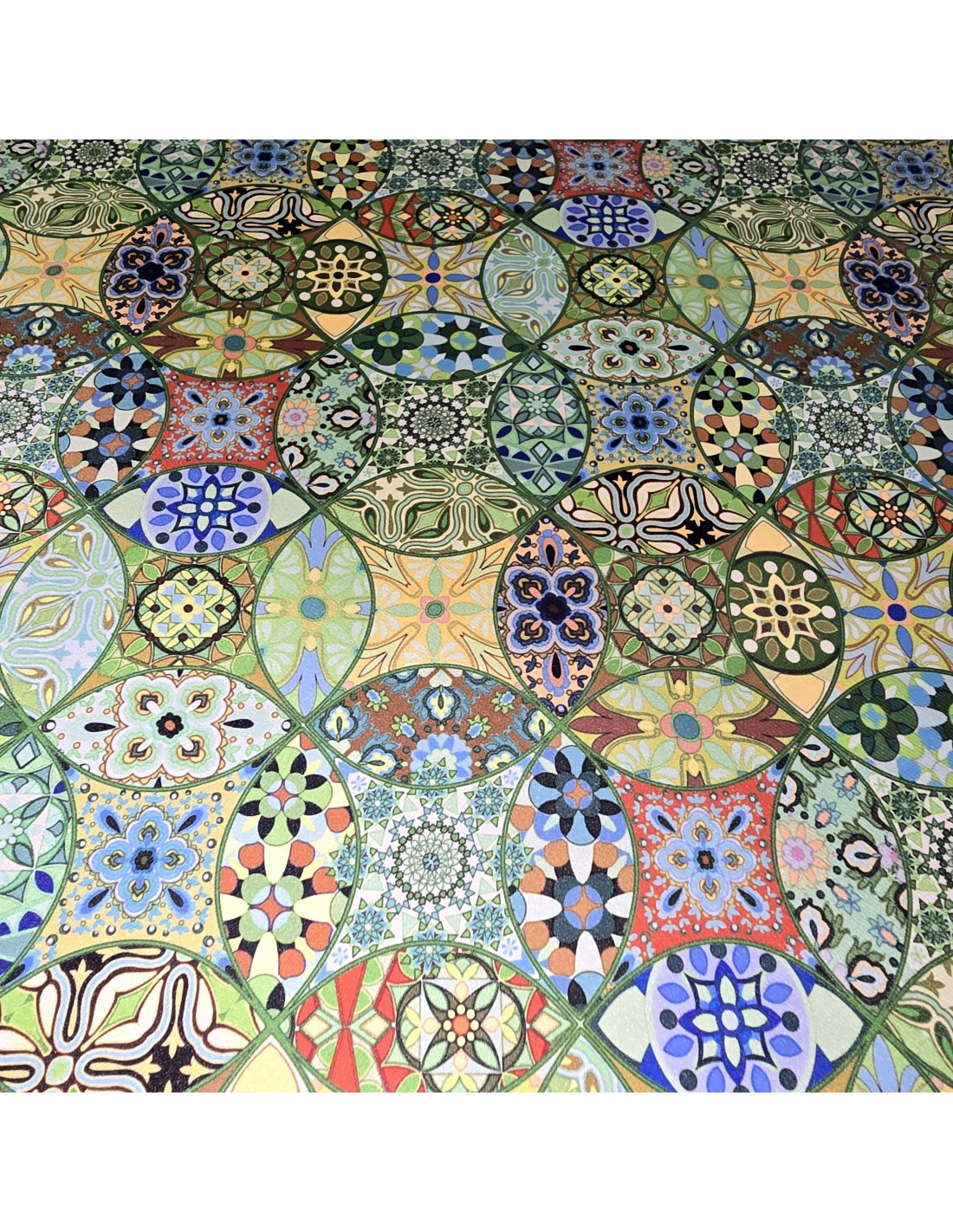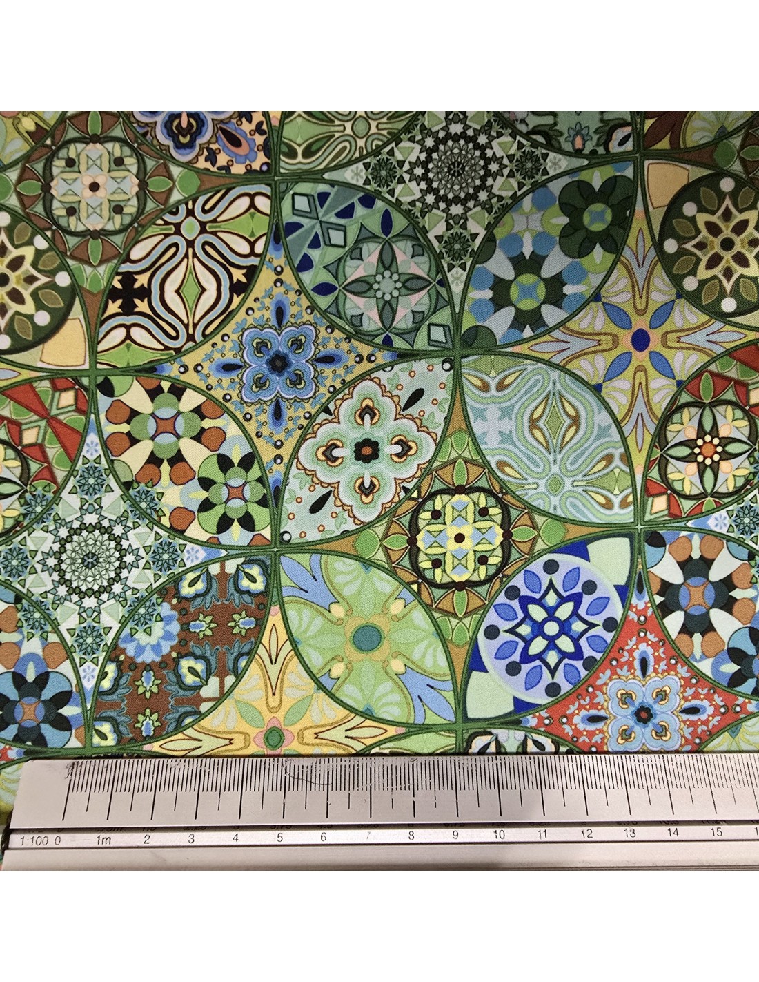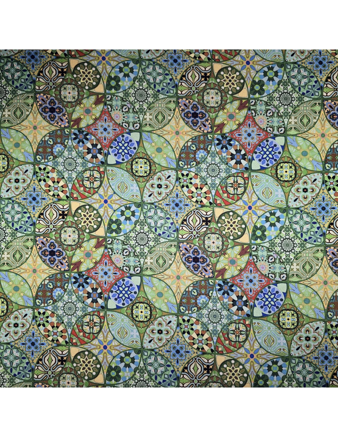 Tessuto in poliestere con lavorazione a Raso Satin mano seta in fantasia con stampa digitale che ricorda un mosaico sul vetro sui toni del Verde, blu, arancione e giallo. Tessuto morbidissimo al tatto con un ottima caduta
