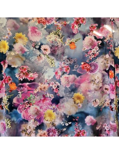 Tessuto in poliestere con lavorazione a Raso Satin mano seta in fantasia con stampa digitale Floreale multicolot. Tessuto morbidissimo al tatto con un ottima caduta