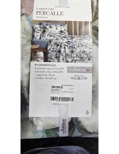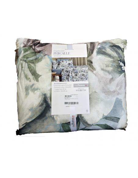 Il Completo Letto Monica di Maè by Via Roma 60 trasforma la tua camera da letto in un'oasi di freschezza ed eleganza. La fantasia floreale sui toni del verde acqua, azzurro, bianco e grigio è delicata e al tempo stesso d'impatto. Il cuore del set è il tessuto: Puro Cotone Percalle. Con una fitta tessitura di 180 fili-inch, il Percalle è noto per la sua mano liscia, setosa e la straordinaria resistenza, garantendo igiene e traspirabilità tutto l'anno.
