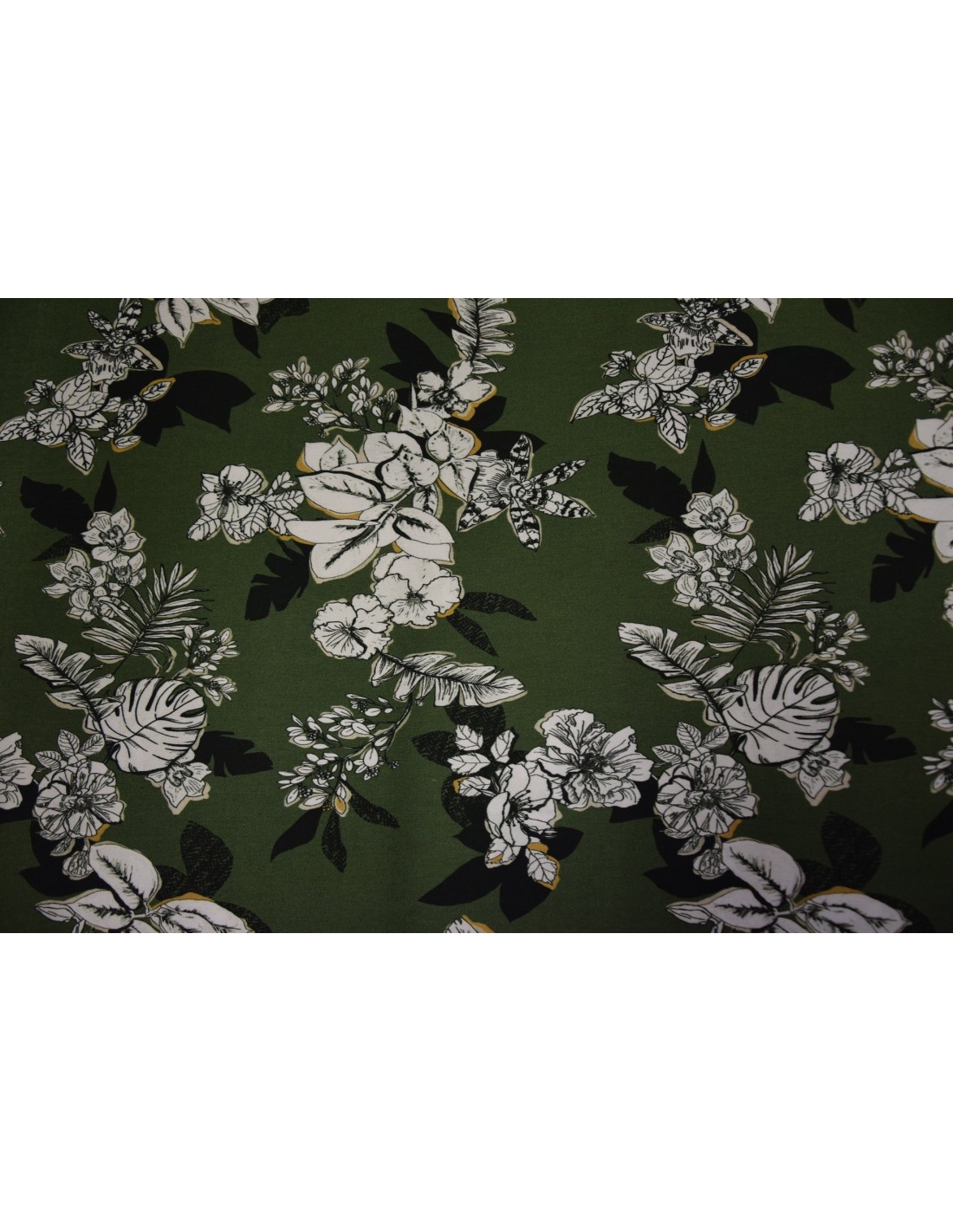 Tessuto in misto Viscosa elasticizzata con fantasia Floreale con fiori bianchi e ombre nere su sfondo avio