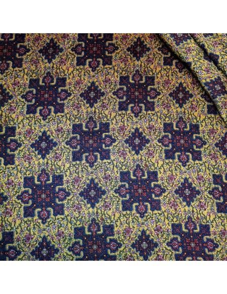 Tessuto in Viscosa con lavorazione Vaiella. Fantasia floreale e geometrica sui toni del senape e del verde, molto morbido al tatto.. Ideale per la stagione Autunno/Inverno