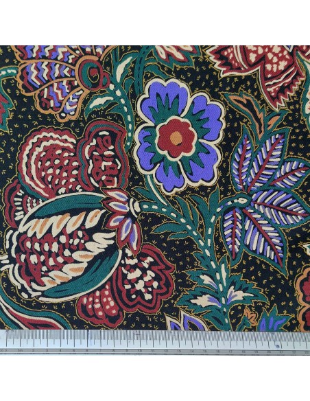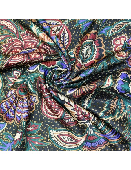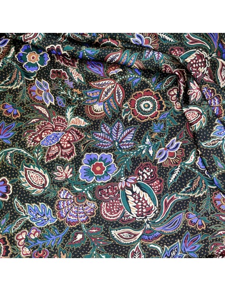Tessuto in Viscosa con lavorazione Vaiella. Fantasia Foliage sui toni del blu e del marrone su sfondo nero, molto morbido al tatto. Ideale per la stagione Autunno/Inverno