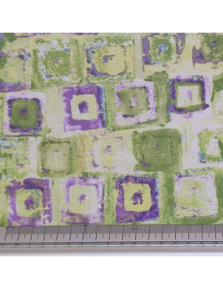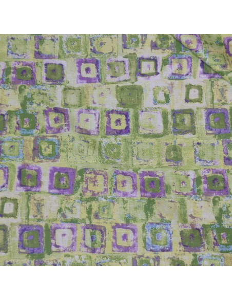 Tessuto in viscosa con lavorazione a shantung. Fantasia geometrica sui toni del verde e del viola, molto morbido al tatto. Ideale per la stagione Autunno/Inverno